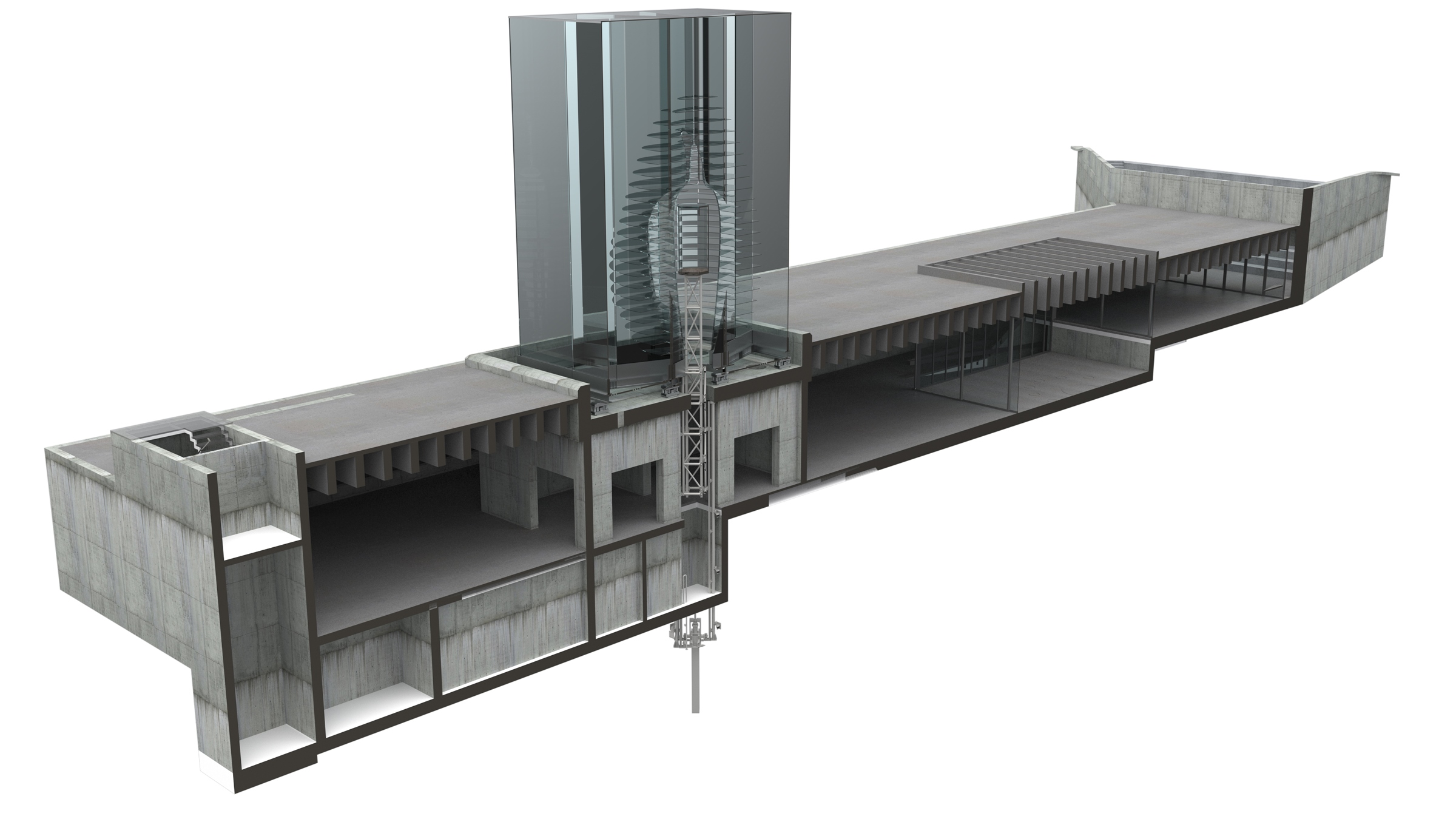 Above the ground a new work of art has been added: a glass pavilion that bridges the gap between architecture and sculpture, a piece of “op-art” providing an optical illusion consisting of different forms – as is typical for the work of Brâncuși, a glass cube in which an oval, fusiform structure shines and shimmers. The building-art-work is thus also a reference to a project that Brâncuși never realized: the Temple of Indore.