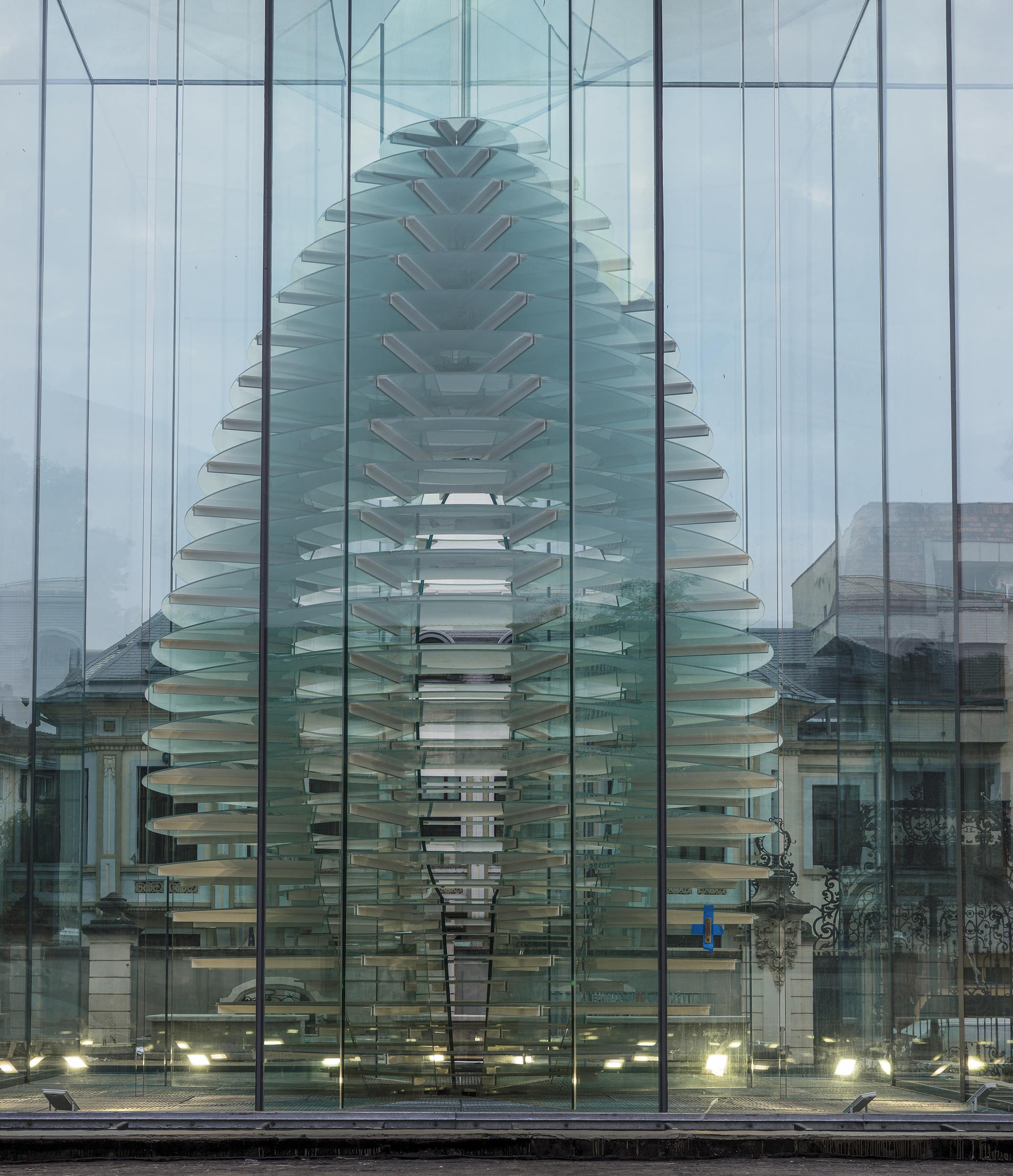When works of art from a sculptor are exhibited underground they need an even stronger above-ground anchor point. This is the idea that led to the creation of the twelve-meter-high cube above the new “Brâncuși Museum” in Craiova, which is dedicated to the work of the great Romanian sculptor Constantin Brâncuși. The imposing all glass construction is a tribute to the artist that is visible from afar. With glass panes that are the full height of the building (sedak) the shell is just as impressive as the filigree interior, also made from glass, which is designed to look sculptural and is based on a typical Brâncuși work – the mythical bird Măiastra.