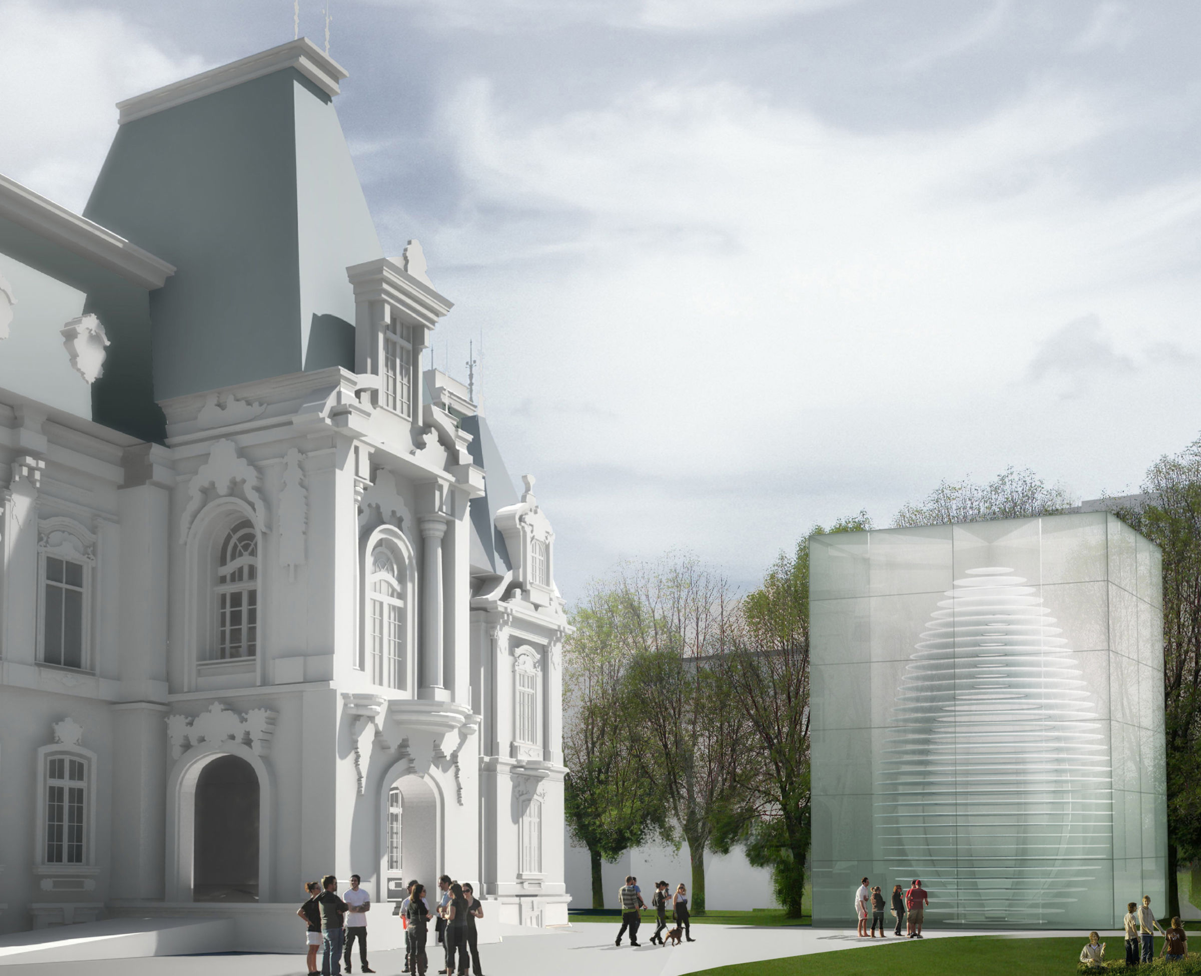 The rendering shows the original building, the Craiova Art Museum, and the glass construction as the new attention-grabber. In this way, the neoclassical building retains its impact despite the increased exhibition space: this was created underground.
