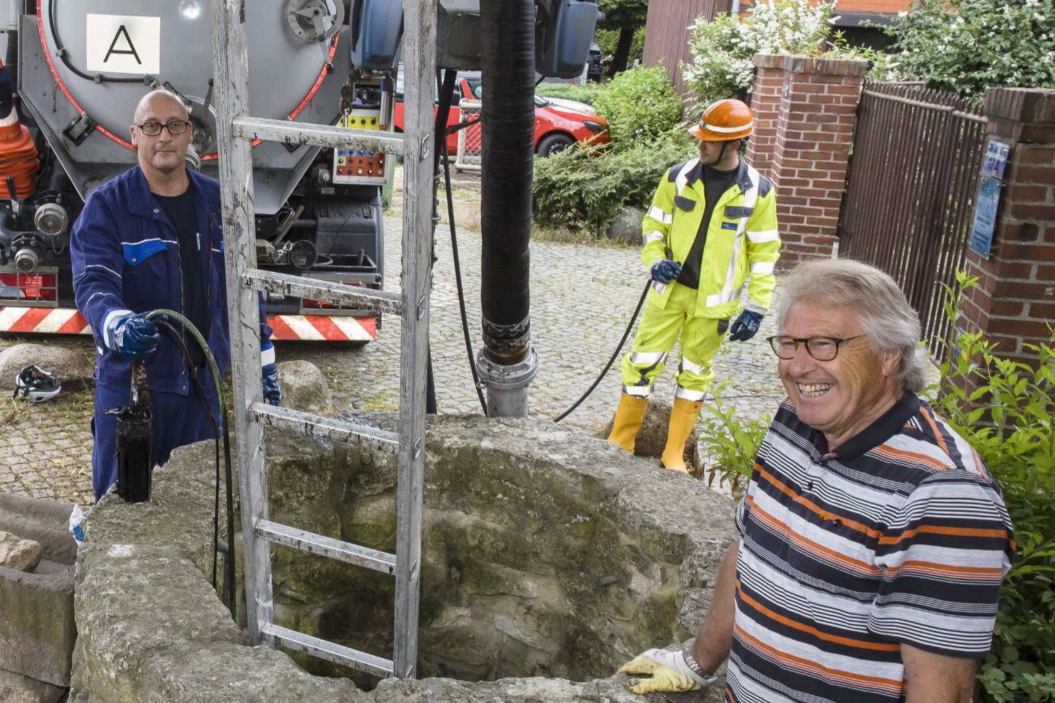 Braunschweig, 19.06.2020 Der historische Bürgerbrunnen im Dorfkern Mascherodes ist seit dem 15. Juni wieder sauber. Möglich wurde dies durch eine gemeinsame Säuberungsaktion der „Wasserbrüder Mascherode“ und der Stadtentwässerung Braunschweig GmbH (SE|BS). Der Bürgerbrunnen war zuletzt stark verschmutzt. Stadtteilheimatpfleger und „Wasserbruder“ Henning Habekost aus dem Braunschweiger Ortsteil Mascherode ist empört über den Müll, der in den Brunnen geworfen wurde: „Man hält es kaum für möglich: Trotz des Metallgitters, das extra auf den Brunnenring montiert ist, quetschen Menschen Zigarettenkippen, Plastikverpackungen, Hundekotbeutel und anderen Abfall hinein.“ Da die ortsansässige Feuerwehr keine Spezialfahrzeugtechnik hat, die den für das Grundwasser gefährlichen Müll wieder hinaus holen kann, rief Habekost die SE|BS zu Hilfe. Enno Barner, Teamleiter Kanalnetz: „Wir haben absolut kein Verständnis dafür, dass unser Wasser absichtlich verunreinigt und in Gefahr gebracht wird. Jeder weiß doch – ohne Wasser kein Leben!“ Habekost ergänzt: „Alleine hätten wir die Reinigung nur mit viel Mühe und Not geschafft – wir freuen uns deshalb enorm über die Unterstützung.“
