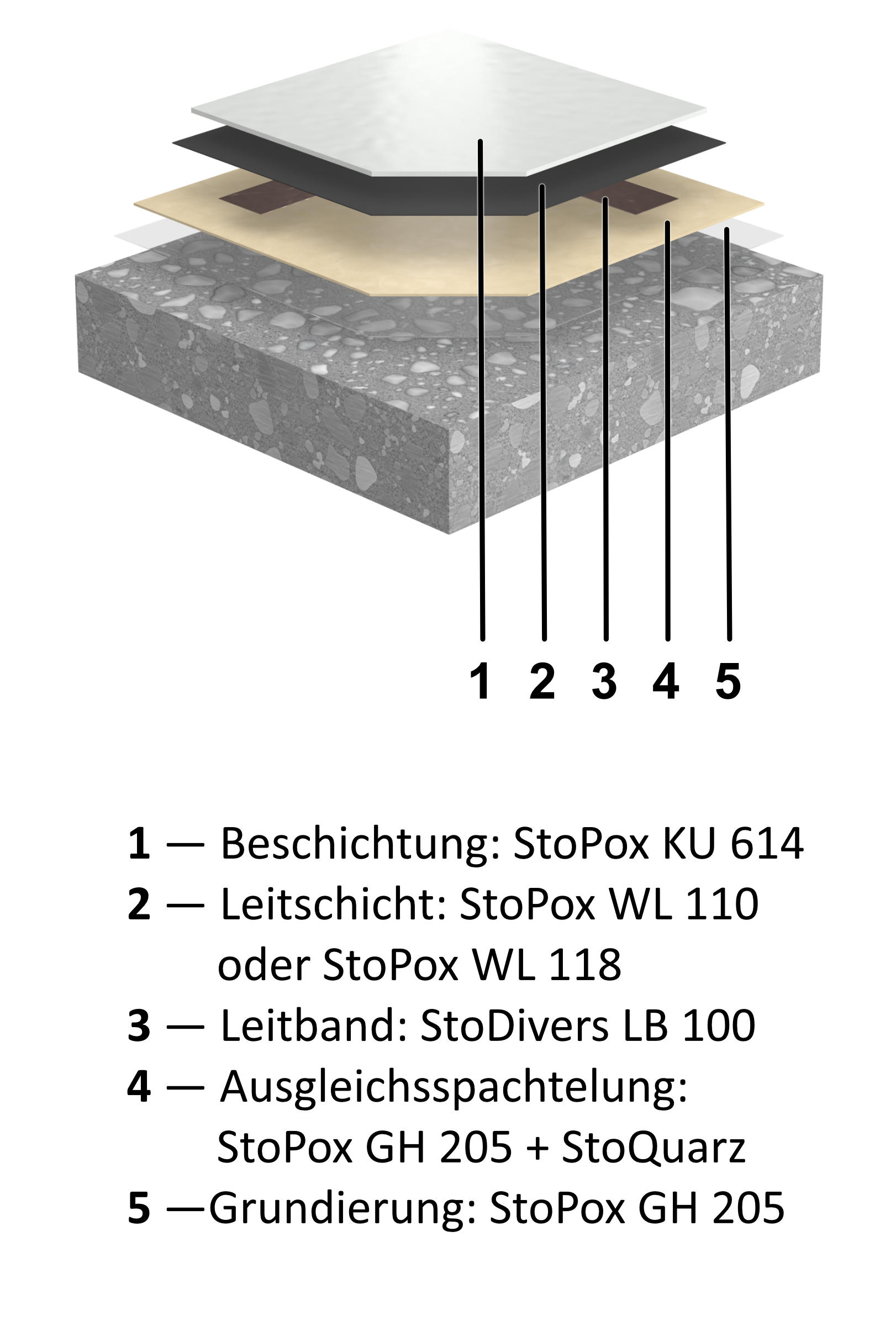 StoPox KU 614 ist mechanisch und chemisch gut beständig und bietet durch seine hohe Schichtdicke eine größere Verschleißreserve als vergleichbare Beschichtungen. Daraus resultiert eine lange Nutzungsdauer mit langfristig niedrigen Unterhaltskosten. Es wird vorwiegend auf mineralischen Unter¬gründen im Neubau eingesetzt. Das niedrigviskose Material verläuft sehr gut und lässt sich dadurch einfach verarbeiten. Seine große Farbtonauswahl gestattet auch individuelles Design. Zudem lässt sich die Beschichtungsoberfläche in verschiedenen Rutschhemmklassen einstellen. Hierfür stehen geprüfte Systemaufbauten bereit.