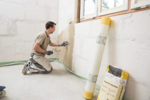 Die Innenwände verspachtelte Schmid mit StoLevell Calce RP und StoLevell Calce FS. Die auf Kalk basierenden Produkte dienen als Funktionsspachtelmasse oder Unterputz und halten mit ihrer natürlichen Feuchtepufferung das Wohnklima angenehm: Sie puffern Feuchtespitzen in der Raumluft, selbst in den Bädern.