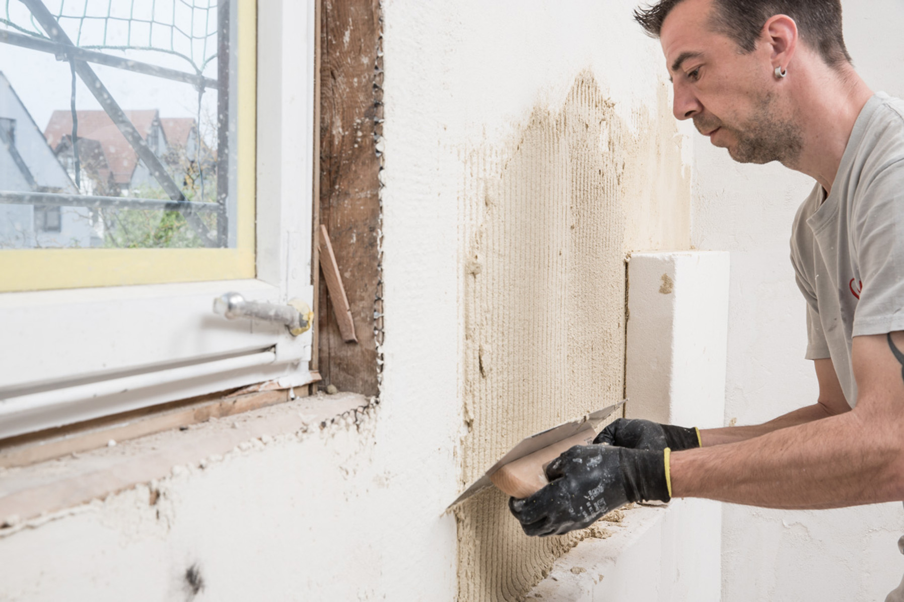 Im Zuge der Sanierung war das Haus auch energetisch zu modernisieren. Da eine Außendämmung bei dem Denkmal ausschied, verlegte Schmid die thermische Optimierung der historischen Fassade nach innen und wählte dafür das Innendämmsystem StoTherm In Comfort. Der Fachhandwerker und seine Mitarbeiter verklebten die diffusionsoffenen Perlite-Dämmplatten mit dem Klebemörtel StoLevell In Mineral, um einen komplett mineralischen Systemaufbau zu erzielen. Als Schlussbeschichtung kamen die silikatischen Innenfarben „StoColor Sil In“ sowie „StoSil Struktur“ zum Einsatz. Die strukturierbare Farbe wurde zunächst mit einer Rolle appliziert und anschließend mit einer Strukturwalze fein modelliert. Ein warmer Sandfarbton schafft eine harmonische Raumatmosphäre.