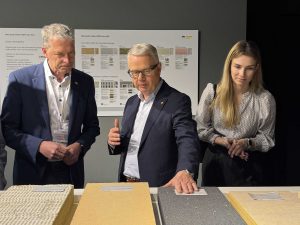 Sto-CEO Rainer Hüttenberger (Mitte) erläutert den FDP-Politikern Jochen Haußmann und Nathalie Wagner die verschiedenen Dämmstoffe.