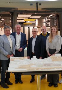 Rainer Hüttenberger erörtert FDP-Politikern das Modell des geplanten Innovations-Campus von Sto in Stühlingen: (v.l.) Christoph M. Stolz, Leiter Public Affairs bei Sto, Klaus Denzinger, Jochen Haußmann, Sto-CEO Rainer Hüttenberger, Hans-Peter Zimmermann und Nathalie Wagner.