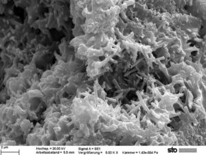 Die Aufnahme mit dem Raster-Elektronenmikroskop zeigt die mikroskopische Struktur der Epoxy-Hybrid-Beschichtung.