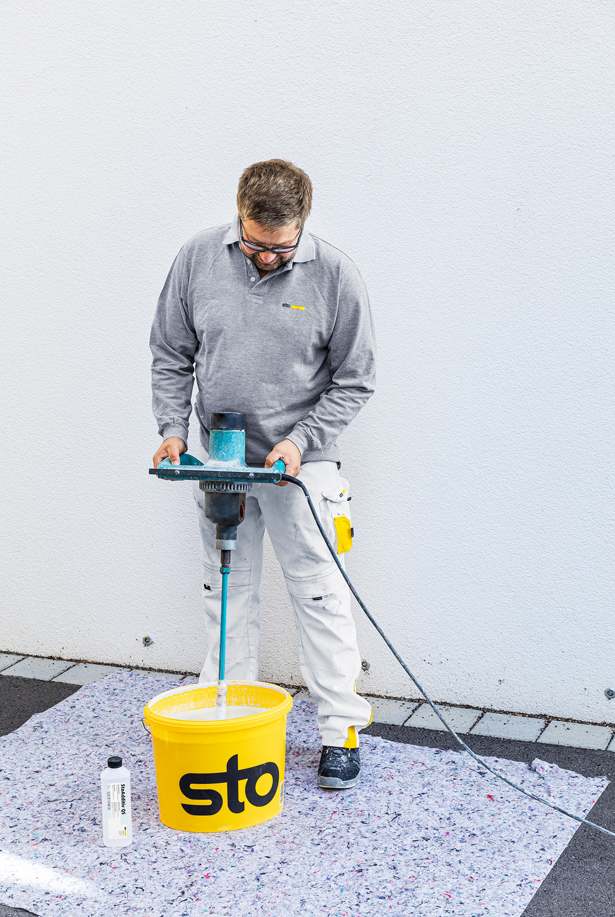 Das StoAdditv QS wird spontan und einfach auf der Baustelle in Fassadenfarben gemischt.