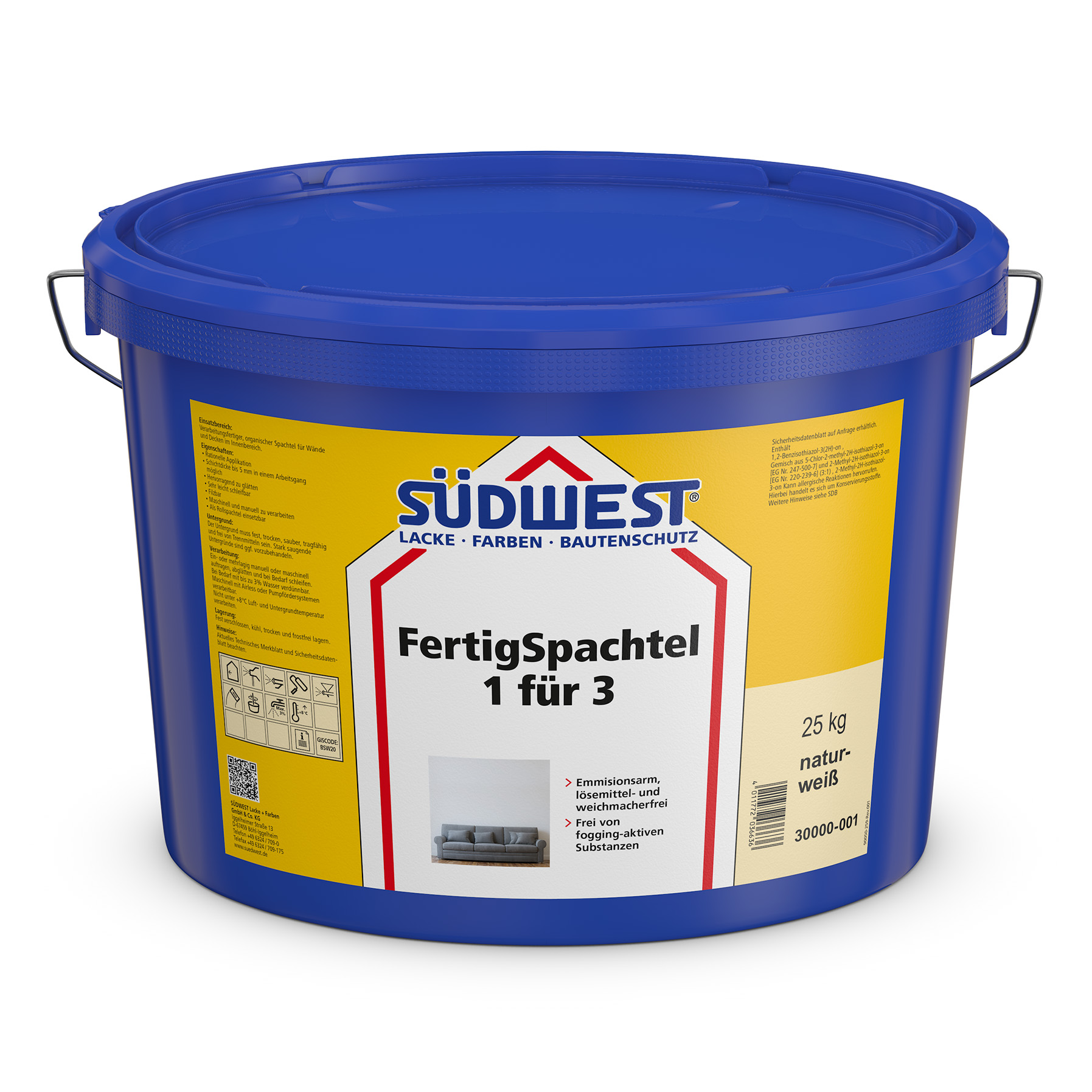 Für alle gängigen Verarbeitungstechniken eignet sich der neue pastöse „Fertigspachtel 1 für 3“. Ob per Hand, gerollt oder gespritzt: Für alle Anwendungen wird nur noch ein Produkt benötigt, das Anmischen entfällt. Der sehr feine, organische Innenspachtel lässt sich aufgrund seiner speziellen Rezeptur besonders einfach und wirtschaftlich verarbeiten. Alle Qualitätsstufen (bis Q4) lassen sich mühelos erreichen. Zudem ermöglicht der Fertigspachtel durch seine Filzbarkeit staubfreie Glättung und lässt sich selbst in der „0-Zone“ sehr gut schleifen. Aufgrund seiner Saugfähigkeit ist er darüber hinaus optimal für weitere Beschichtungen – hierfür bietet Südwest ein umfangreiches Innenfarben-Sortiment.