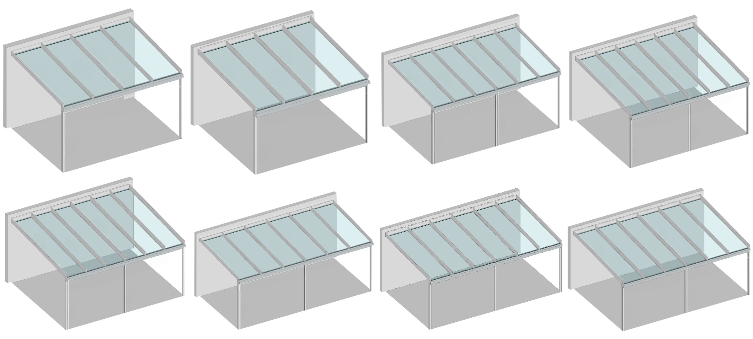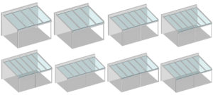 Das neue Fixdach von TS-Aluminium – lieferbar in zwölf Farbtönen und acht Größen von 4 x 3 Meter (oben links) bis 6 x 4 Meter (unten rechts).