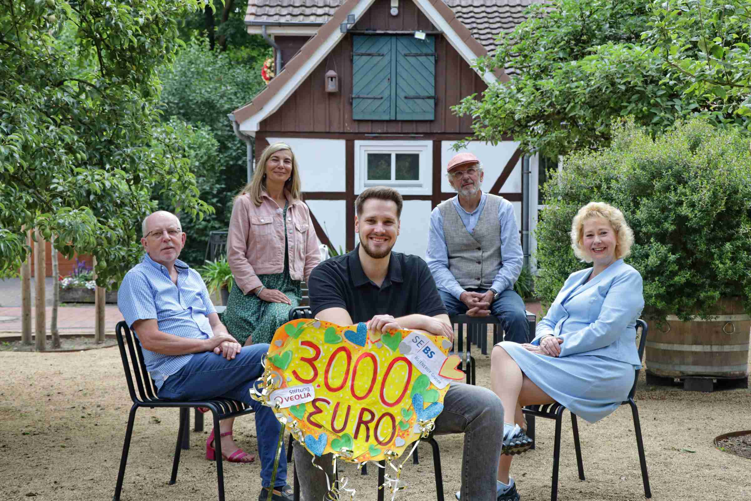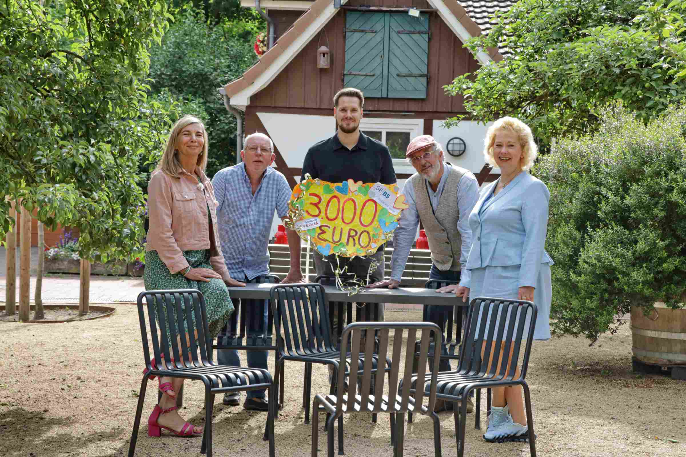 Wieder schön draußen sitzen: Der Schul- und Bürgergarten Dowesee erhielt jetzt neue Tische, Stühle und Bänke. Die Veolia Stiftung hat den Kauf mit einer Spende von 3.000 Euro unterstützt. Judith Kraft, Geschäftsführerin der Stadtentwässerung Braunschweig GmbH (SEBS), Ina Patricia Rieger (Öffentlichkeitsarbeit SEBS) und Marvin Fuhrmann als Spendenpate (SEBS) übergaben die Spende jetzt symbolisch an die Vereinsvorsitzenden Detlev Rickert und Thomas Ellwart.