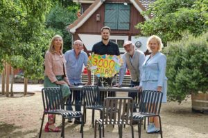 Freuen sich über neue, hochwertige Gartenmöbel (v.l.): Detlev Rickert (Förderverein Dowesee); Ina Patricia Rieger (SEBS) Spendenpate Marvin Fuhrmann (SEBS), Thomas Ellwart (Förderverein Dowesee) und Judith Kraft (Geschäftsführerin SEBS)