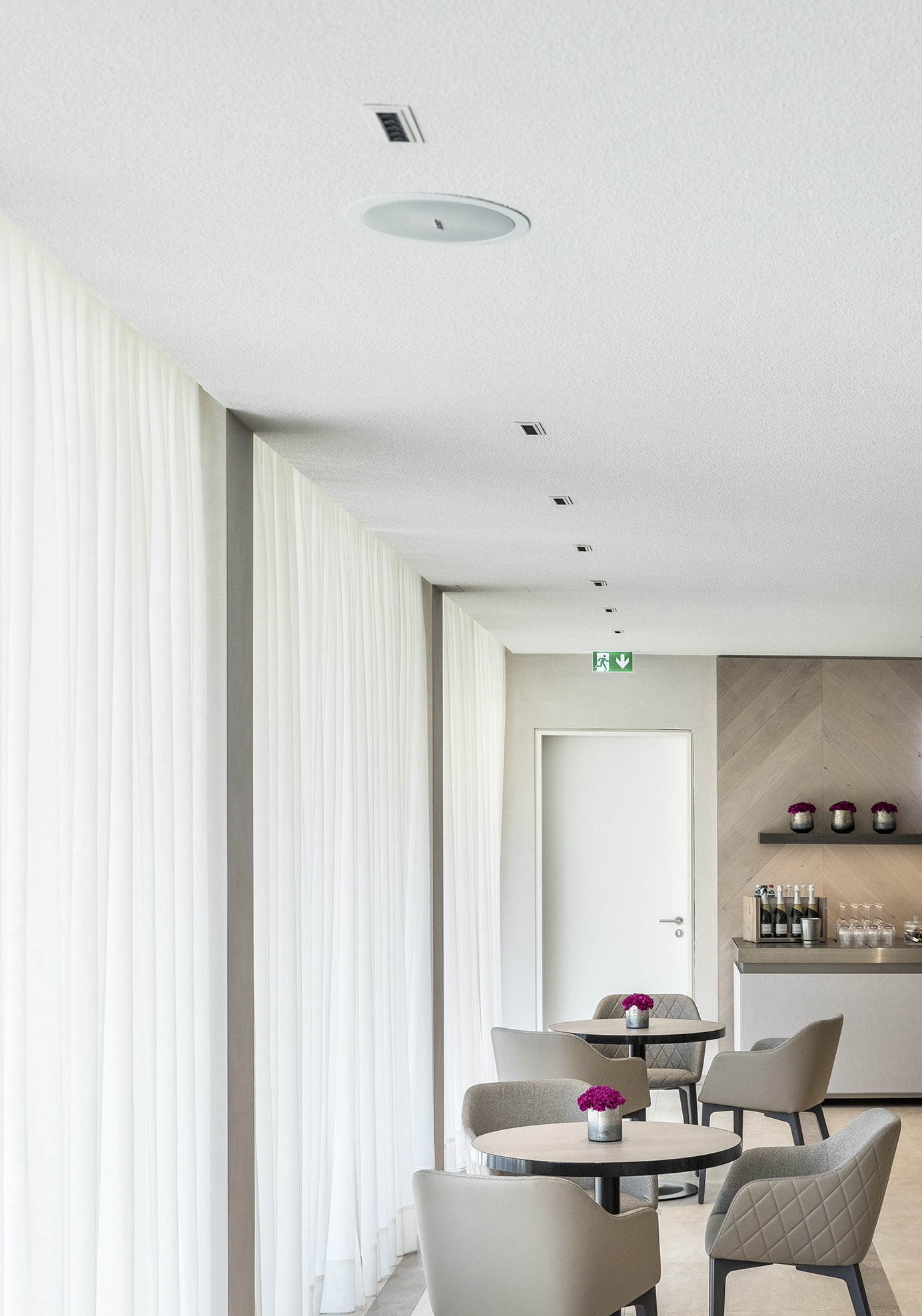 In das abgehängte System lassen sich verschiedene Funktionen integrieren: Zuluft-Elemente, Leuchten und Lautsprecher sind elegant eingebaut, die Decke wirkt optisch einheitlich und zurückhaltend. Zugleich entsteht eine ruhige Atmosphäre ohne wahrnehmbaren Nachhall. StoSilent Distance A2 ist mit einem Schallabsorptionsgrad von 0,8 bewertet (nach EN 11654), Messungen in der Ruhezone des Spa erbrachten sogar eine Nachhallzeit von 0,4 Sekunden.