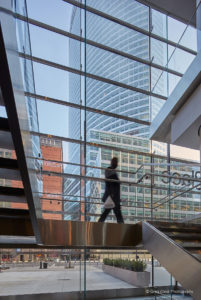 Der Nordeingang des Brookfield Place beeindruckt mit einer Ganzglasfassade. Bis zu sieben Meter lange Glasschwerter der Firma sedak tragen die Fassadenscheiben und steigern so die ohnehin hohe Transparenz.
