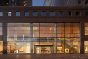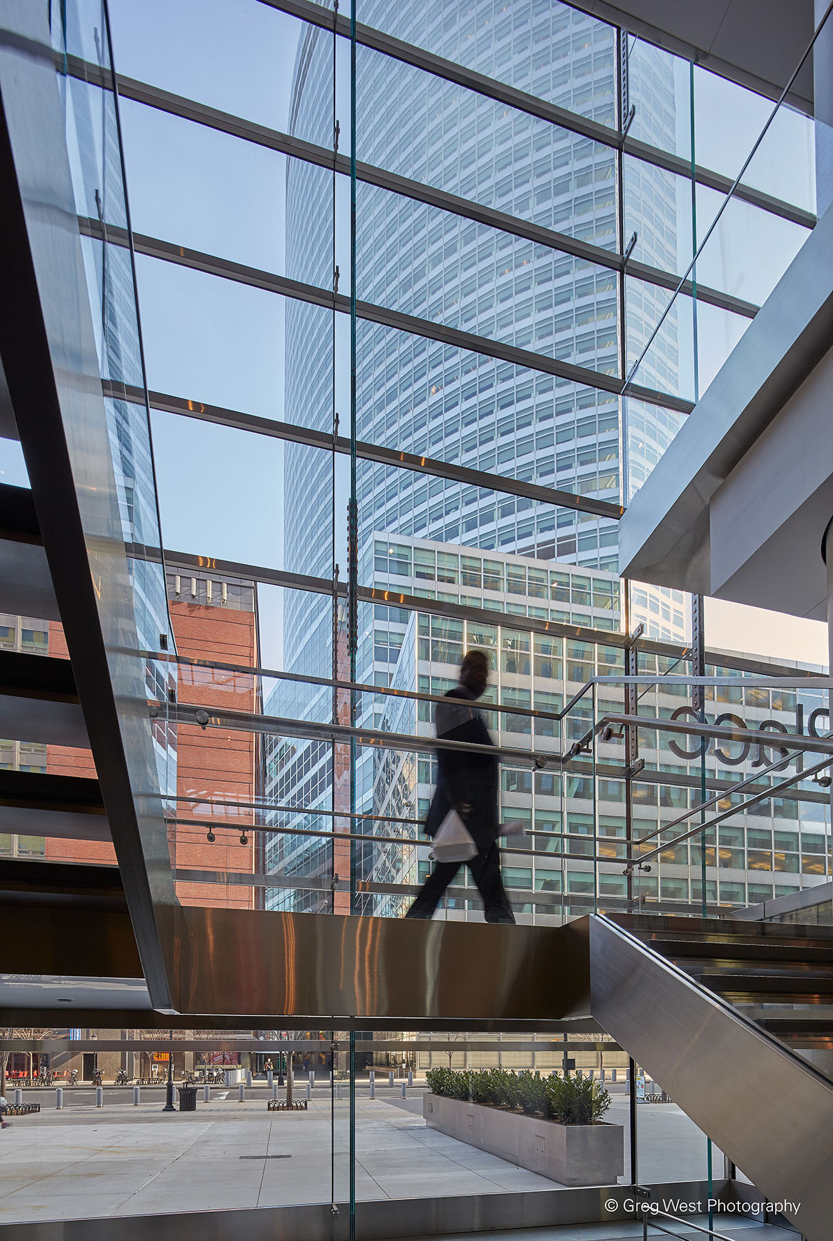 Das architektonische Highlight sind die beiden großzügigen Eingangsfassaden auf der Nord- und der Südseite, die fast ausschließlich aus Glas bestehen. Selbst die tragenden Elemente sind aus Glas – deren Herstellung besonderes Know-how und besondere Produktionstechnik erforderte. Realisiert wurden die großen Glasschwerter in Deutschland: Die auf Großformate spezialisierte sedak fertigte in enger Abstimmung mit dem Planungsbüro die Fins und schickte sie dann ein Mal um die halbe Welt von Gersthofen in Bayern nach New York City. Die Laminate aus drei mal zwölf Millimeter Glas haben eine Länge bis sieben Meter. Die Konstruktion selbst braucht nur wenige Verbindungselemente. So scheint die gesamte Fläche vollständig aus Glas zu bestehen, die sonst üblichen Stahlträger gibt es nicht. Zum Hudson River hin misst die Fassade 12 mal 27 Meter, zur Vesey Street sind es 17 Meter Höhe bei 21 Meter Breite.