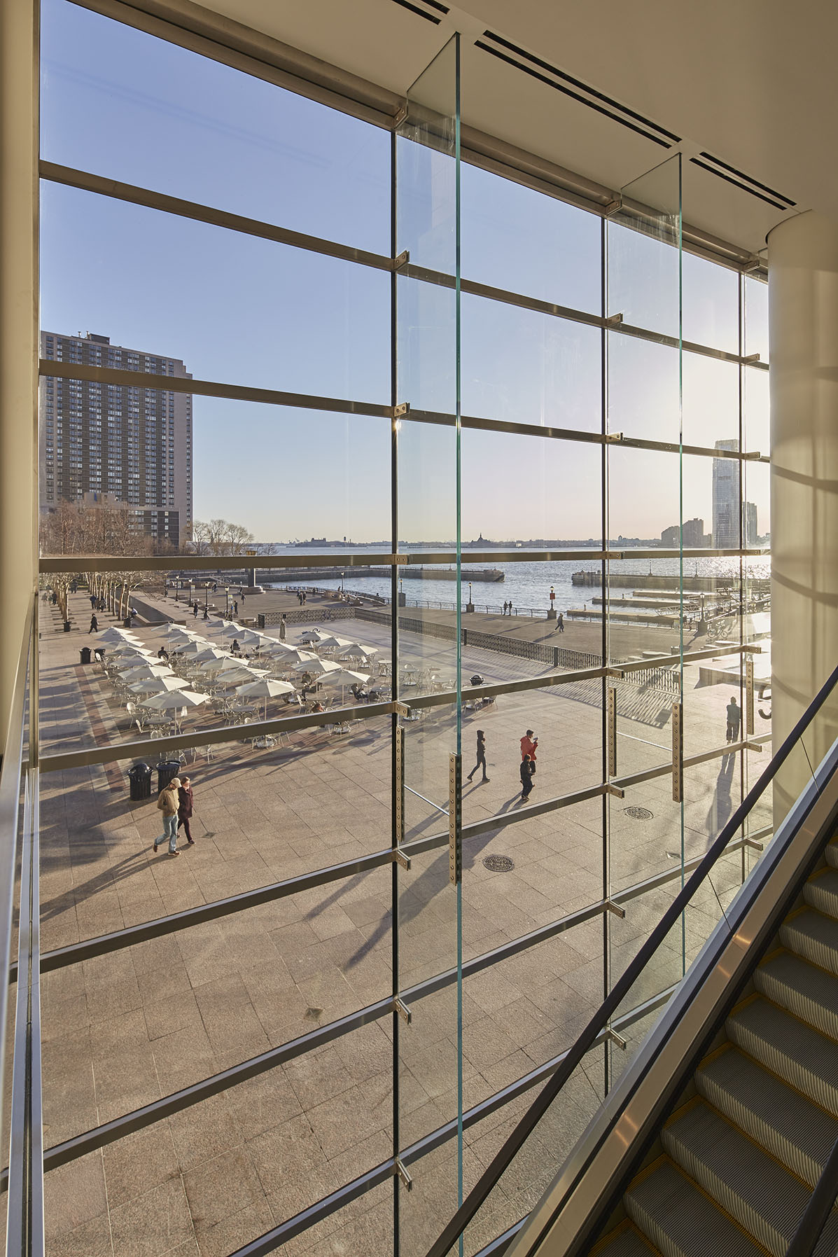 Die Transparenz der Ganzglasfassade sorgt für Offenheit und eine freie Sicht auf den Hudson River. Störende Metallkonstruktionen sind dank der 7 Meter langen Glasaufhängungen überflüssig.