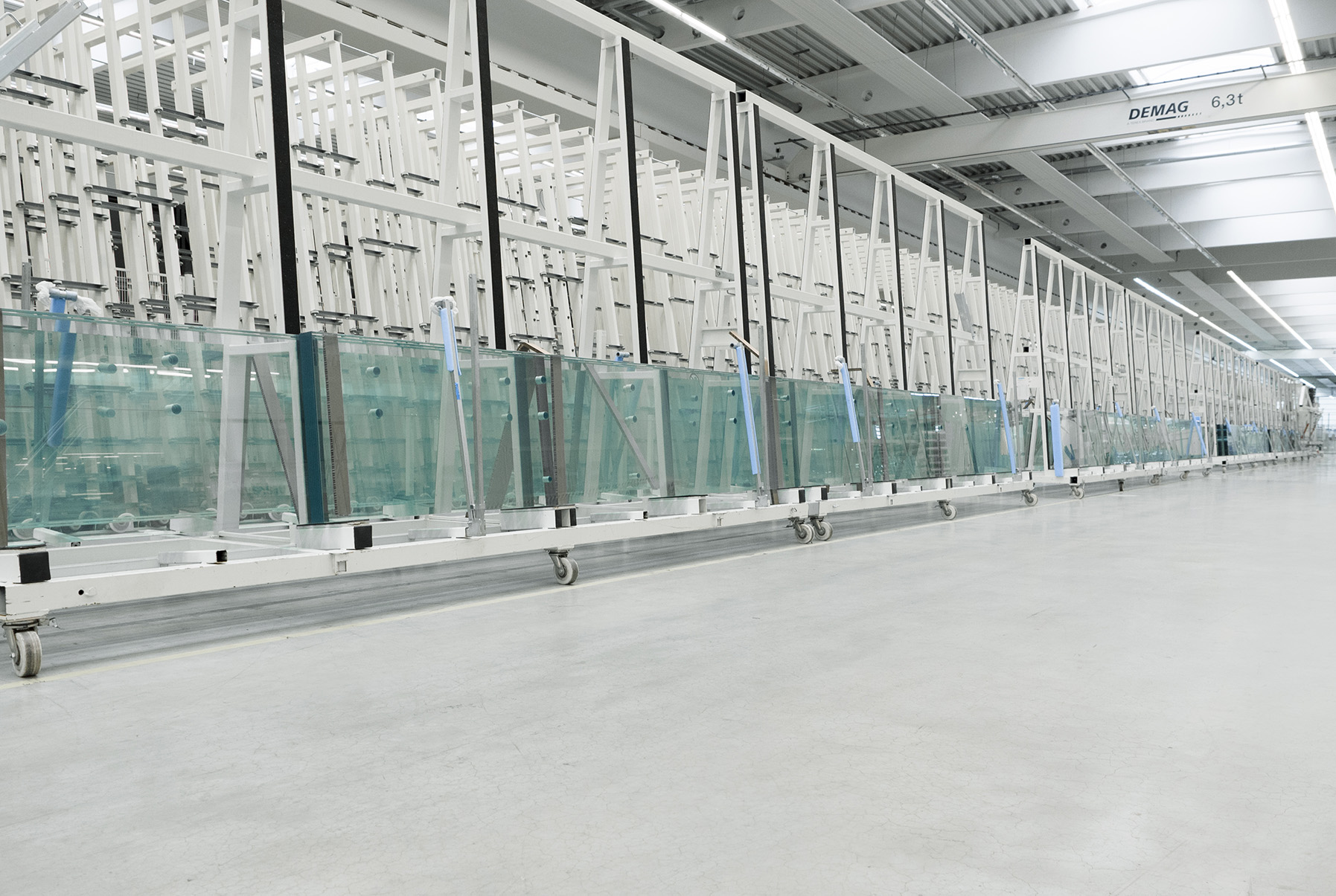 Glasfins mit fünf- bis zehnfachem Glasaufbau in der sedak Fertigung: Sie kommen in Ganzglasfassaden, repräsentativen Foyers oder großflächigen Ganzglasdächern zum Einsatz.