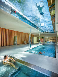 Ein gläserner Boden und eine ebenso transparente Beckenwand aus Glas – dadurch wird ein Swimming Pool mit ungewöhnlichen Ausblicken zum besonderen Hingucker. Gleichzeitig fungiert er als Dachlicht für die Ausstellungsfläche eines österreichischen Pool-Spezialisten. Die beiden sedak-Gläser verwandeln das Schwimmbecken in einen so genannten „Infinity-Pool“. Sie bieten dem Schwimmer ein gefühlt grenzenloses Schwimmerlebnis in fünf Metern Höhe. Zugleich demonstrieren sie die Leistungsfähigkeit des Werkstoffes: In dem ungefähr 1,20 Meter tiefen Becken liegt eine Wasserlast von circa 38 Tonnen auf dem 13 x 2,5 Meter großen Isolierglas, das den Beckenboden des Pools bildet. Konstanter Druck gegen die gläserne Beckenwand fordert den Baustoff dort.