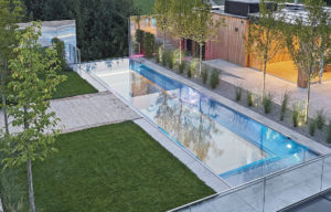 Das gefühlte Verschwimmen der Grenzen vom Pool zur Umwelt rührt zu einem großen Teil von dem gläsernen Beckenrand her, der bündig mit der Wasseroberfläche abschließt und die äußere Begrenzung des Daches bildet. So verschmelzen Horizont und Wasserspiegel zu einem harmonischen Übergang – auch unter Wasser ist die Umgebung gut erkennbar. Mit Blick nach unten offenbart der gläserne Poolboden dem Schwimmer darunterliegende Ausstellungsräume und ist zugleich Lichtquelle für den Innenraum im Stile eines Atriums. Wird Sonnenlicht im Wasser gebrochen, entstehen spannende Reflexionen, die im Raum für eine einzigartige Lichtatmosphäre sorgen.