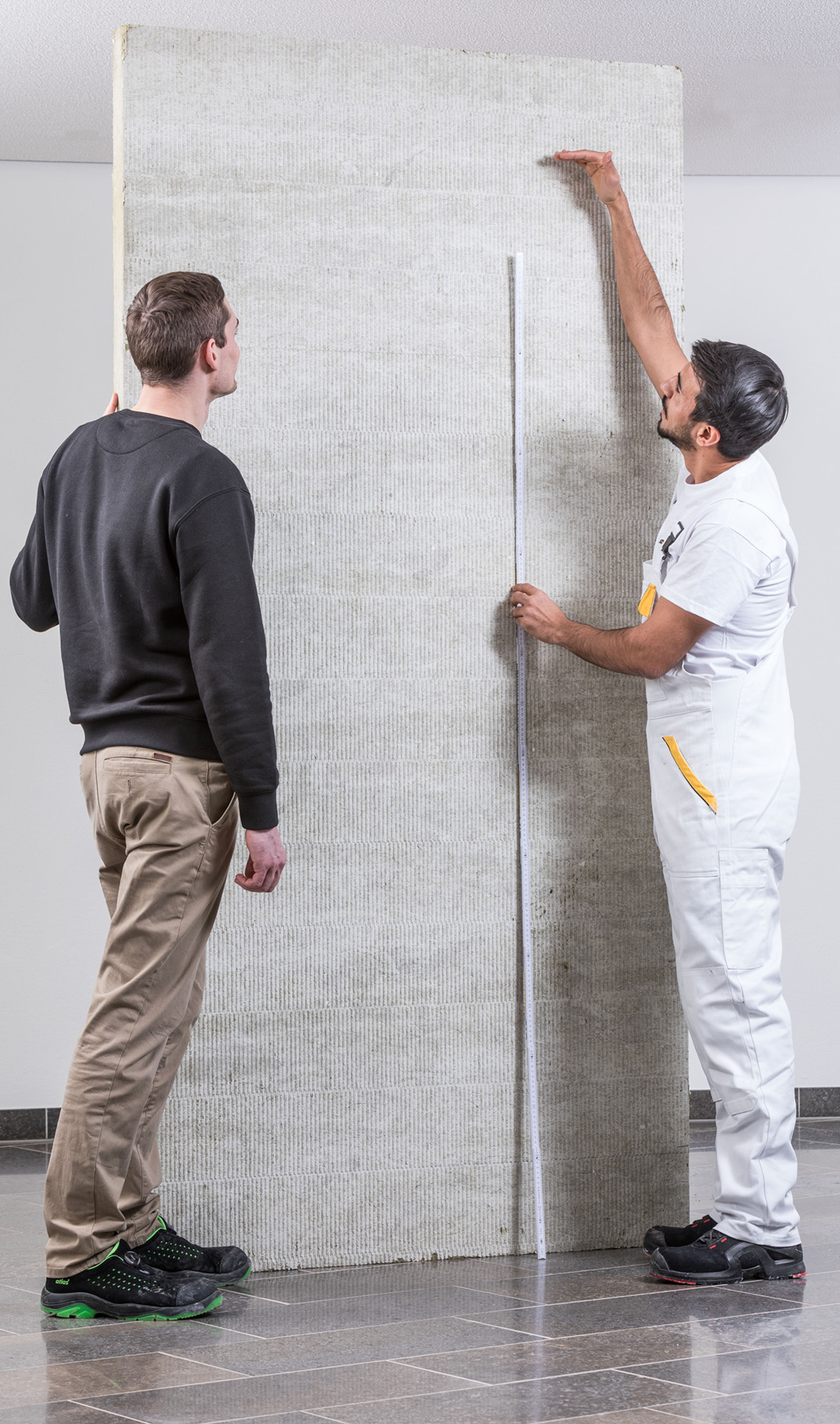 Möglich wurde diese radikale Neuerung durch die exakte Abstimmung der einzelnen Systembestandteile vom Kleber bis zum Oberputz. Deutliche Vorteile bietet die Sto-Steinwolleplatte Xtra 2/B/H4 (WLG 035). Sie ist etwa 30 Prozent leichter als herkömmliche Mineralwolledämmstoffe und wird ohne Einsatz von Dübeln vollflächig auf Plattenwerkstoffen aus Holz verklebt. Ihr Format ist mit bis zu 2.400 x 1.200 Millimetern auf die Prozesse des industriellen Fertighausbaus abgestimmt. Da Platten bereits ab Werk beidseitig beschichtet sind, stellen sie einen optimalen Haftverbund sicher; zwischen Vorder- und Rückseite muss nicht unterschieden werden, das Einmassieren des Klebers entfällt.