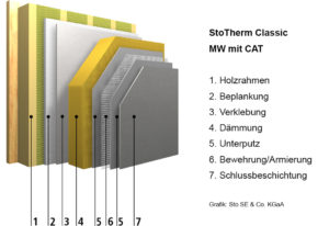 Bei StoTherm Classic MW mit CAT (Clever Adhesive Tech­nology) werden großformatige Steinwolledämmplatten (bis zu 2.400 x 1.200 mm) künftig nur noch geklebt; Dübel werden nicht mehr benötigt. Der Aufbau des WDVS erfolgt dabei – abgesehen vom Dämmstoff – mit exakt den organischen Klebe- und Armierungsmassen (StoPrefa Coll und StoPrefa Armat) wie beim Einsatz von Polystyrol (EPS). Ein Wechsel zwischen Mineralwolle und EPS ist daher jederzeit ohne Rüstzeiten möglich. Als Oberputze stehen der langzeitbewährte Silicon­harzputz StoSilco und der besonders umweltfreundliche StoSilco blue ohne bioziden Filmschutz zur Verfügung.