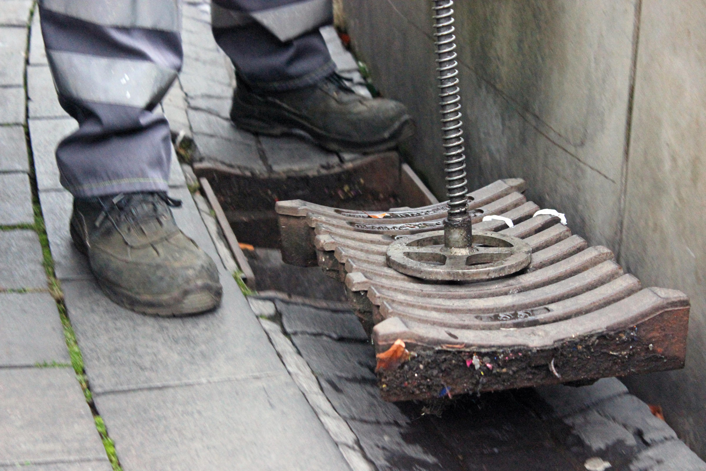 „Gully-Pflege“: Mit einem speziellen Hebegerät wird das Gitter über dem Sinkkasten abgehoben.