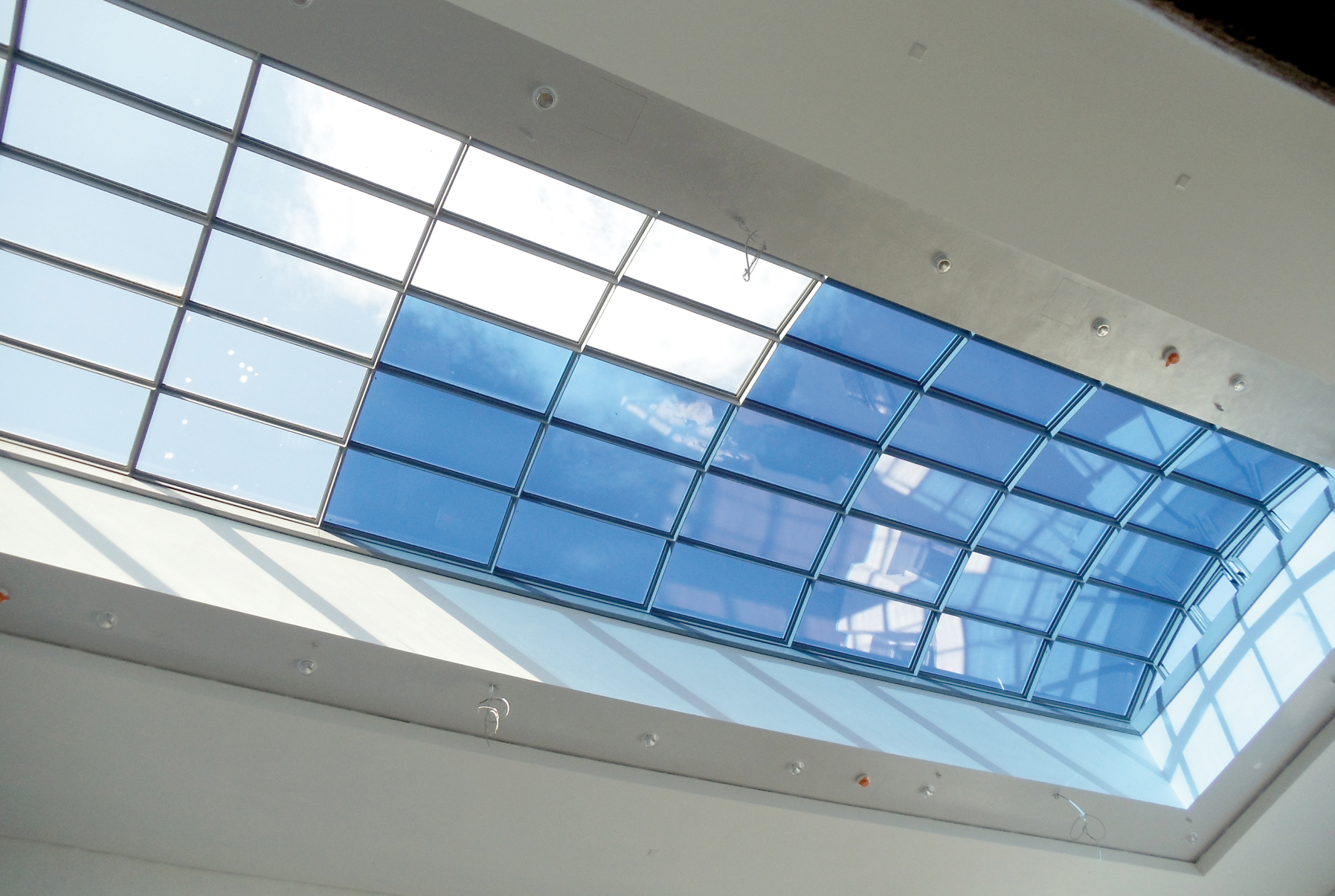 Das elektrochrome Sonnenschutzglas garantiert fast hundertprozentigen UV-Schutz unter dem großflächigen Glasdach. Der blaue „kühle“ Lichtanteil des Sonnenlichtspektrums gelangt hingegen weiterhin in den Raum: Der blaue Ton harmoniert exzellent mit dem natürlichen Blau des Himmels und fördert gleichzeitig die Vitalität. EControl Smart erfüllt im VSG-Aufbau die Sicherheitsanforderungen für Überkopfverglasung. Das Stahlgerüst mit T-Profilen segmentiert das Dach gewichtssparend, dennoch sichern zwölf Befestigungspunkte mit jeweils 200 Kilogramm Tragkraft das Gewicht. In der Dachkonstruktion ist auch die Veranstaltungstechnik untergebracht: Lautsprecher und Bühnenbeleuchtung sowie eine LED-Beleuchtung mit Farblichtsteuerung.