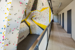 Innen sorgt der Naturwerkstein „VeroStone Jura Cream“ für eine natürlich-ästhetische Optik. Fußböden, Treppen und Fensterbänke sind aus dem Stein gefertigt. Die sandgestrahlte und gebürstete Oberfläche passt dabei perfekt zur eleganten Außenhülle des Kletterzentrums.