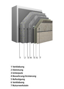 Für den natürlichen Look sorgt ein Spiel aus hellen und dunklen sowie großen und kleinen Steinflächen. Durch die unterschiedlichen Naturstein-Farbtöne und Oberflächenausführungen (sandgestrahlt und geschliffen) entstand die architektonisch beeindruckende und gleichzeitig funktionale Fassade des Kubus. Das leicht verspiegelt wirkende Äußere wird ergänzt durch schwarze Zementfaserplatten und Photovoltaik-Paneele. Letztere sorgen in Kombination mit der Wärmedämmung für ein energetisch nachhaltiges Gebäude. Dabei war die Montage des modularen Stein-WDVS-Systems Neuland für alle Beteiligten. Um die bis zu 100 Zentimeter langen Platten aus Jura- und Muschelkalk bei einer Fassadenhöhe von zwölf Metern zu verkleben, griffen die Verarbeiter auf das Wärmedämm-Verbundsystem „StoTherm Vario“ zurück. „Die Fassade ist durch die Lösung bautechnisch vorbildlich“, erklärt Johann Neumeyer, Geschäftsführer von VeroStone.