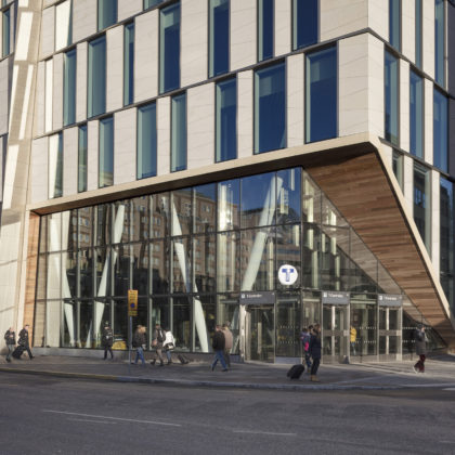 Für den natürlichen Look sorgt ein Spiel aus hellen und dunklen sowie großen und kleinen Steinflächen. Durch die unterschiedlichen Naturstein-Farbtöne und Oberflächenausführungen (sandgestrahlt und geschliffen) entstand die architektonisch beeindruckende und gleichzeitig funktionale Fassade des Kubus. Das leicht verspiegelt wirkende Äußere wird ergänzt durch schwarze Zementfaserplatten und Photovoltaik-Paneele. Letztere sorgen in Kombination mit der Wärmedämmung für ein energetisch nachhaltiges Gebäude. Dabei war die Montage des modularen Stein-WDVS-Systems Neuland für alle Beteiligten. Um die bis zu 100 Zentimeter langen Platten aus Jura- und Muschelkalk bei einer Fassadenhöhe von zwölf Metern zu verkleben, griffen die Verarbeiter auf das Wärmedämm-Verbundsystem „StoTherm Vario“ zurück. „Die Fassade ist durch die Lösung bautechnisch vorbildlich“, erklärt Johann Neumeyer, Geschäftsführer von VeroStone.