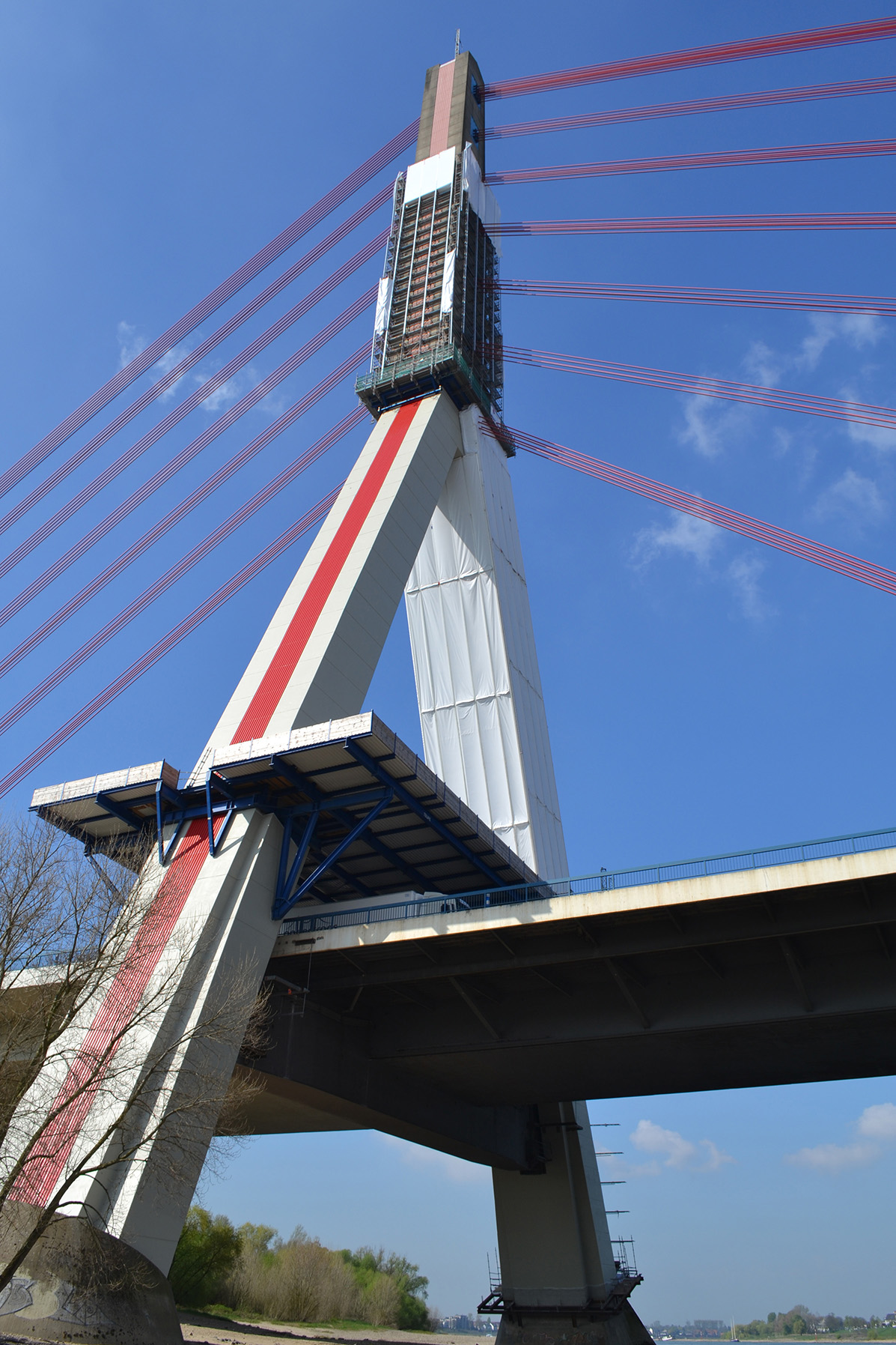 Er sieht aus wie ein auf dem Kopf stehendes Ypsilon, das über dem Rhein in die Höhe ragt – der Pylon der Fleher Brücke. Diesem Pfeiler kommt eine wichtige Aufgabe zu. Er nimmt die Schrägseile der Brücke auf und ist somit tragendes Element für die Gesamtkonstruktion. Der Stahlbeton des Pylons war nach nahezu vierzig Jahren sehr sanierungsbedürftig. Um die Standsicherheit der Fleher Brücke auch zukünftig zu gewährleisten, gab der Landesbetrieb Straßenbau NRW die Instandsetzung des Betonriesen in Auftrag. Zum Einsatz kamen qualitativ hochwertige Produkte von StoCretec.