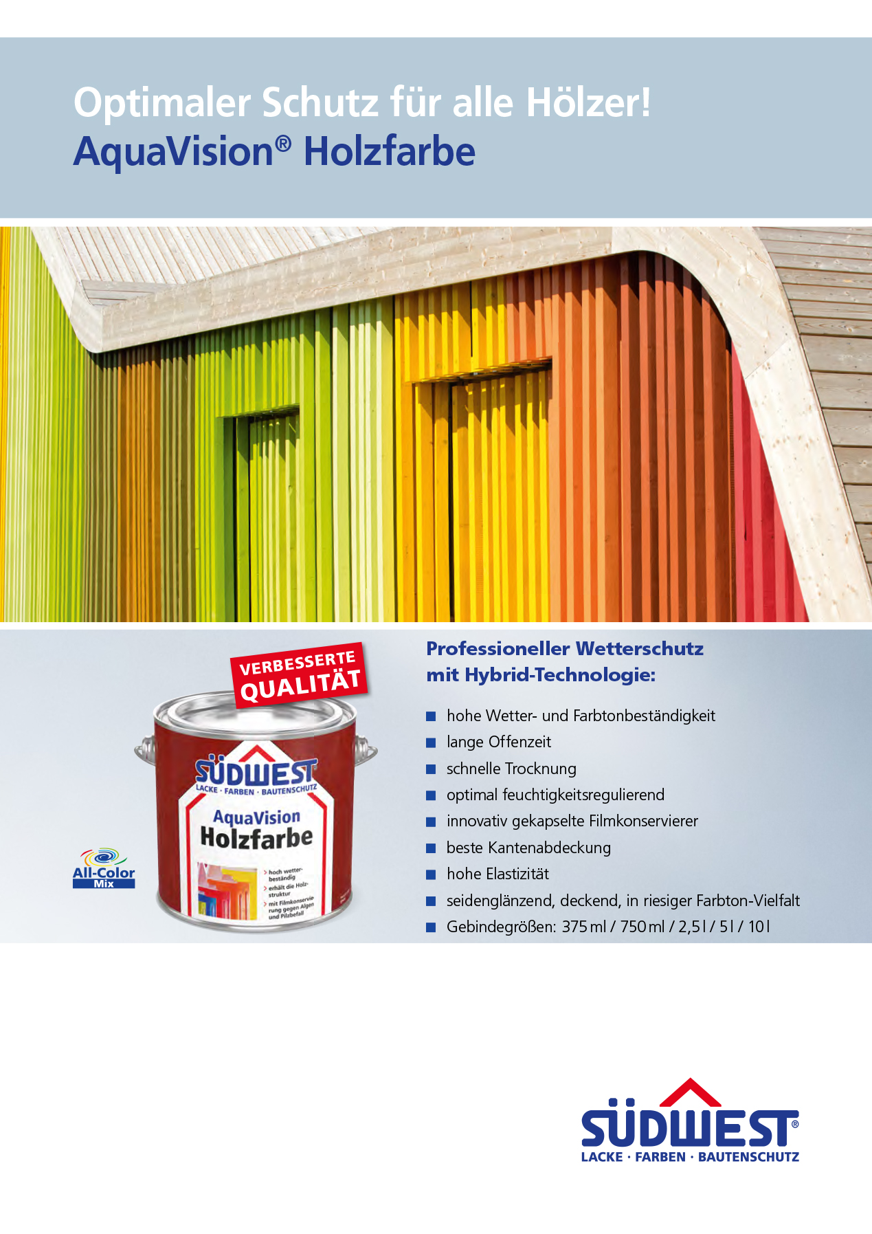 Die bewährte „AquaVision Holzfarbe“ (Südwest, Böhl-Iggelheim) für professionellen Wetterschutz lässt sich jetzt noch besser verarbeiten: Die optimierte Bindemittelkombination aus wasserbasierenden Alkyden mit Acrylaten (Hybrid-System) führt zu langer Offenzeit bei gleichzeitig schnellerer Trocknung. Der Effekt: Es bilden sich so gut wie keine Ansätze beim Streichen. Der integrierte UV-Schutz sorgt für lange Haltbarkeit, vor Algen- und Pilzbefall durch Feuchtigkeit schützen wirkungsvoll moderne verkapselte Filmkonservierer. Auch gestalterisch setzt die seidenglänzende Farbe Akzente: Holzbauteilen wie Fassaden, Pergolen, Carports oder Fensterläden verleiht die AquaVision Holzfarbe schnell ein neues Gesicht. Auch alte, nicht mehr lasierfähige Hölzer können problemlos beschichtet werden. Die charakteristische Holzmaserung bleibt erhalten, die hochwertigen Farbpigmente gewährleisten eine sehr lange Haltbarkeit und hohe Farbtonstabilität. Die „AquaVision Holzfarbe“ lässt sich streichen und eignet sich auch hervorragend für die Spritzapplikation. Mit dem All-Color AquaMix-System lässt sie sich in nahezu unbegrenzter Farbtonauswahl tönen.