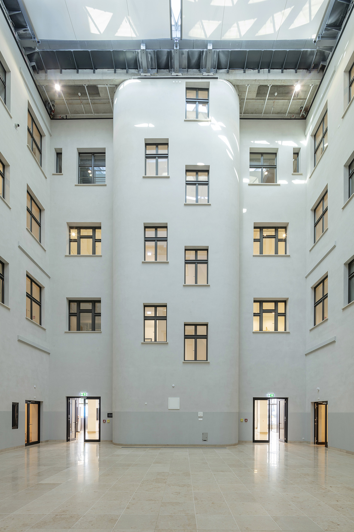 Auf den Fassadenflächen des Atriums reduziert ein Akustiksystem den Nachhall.