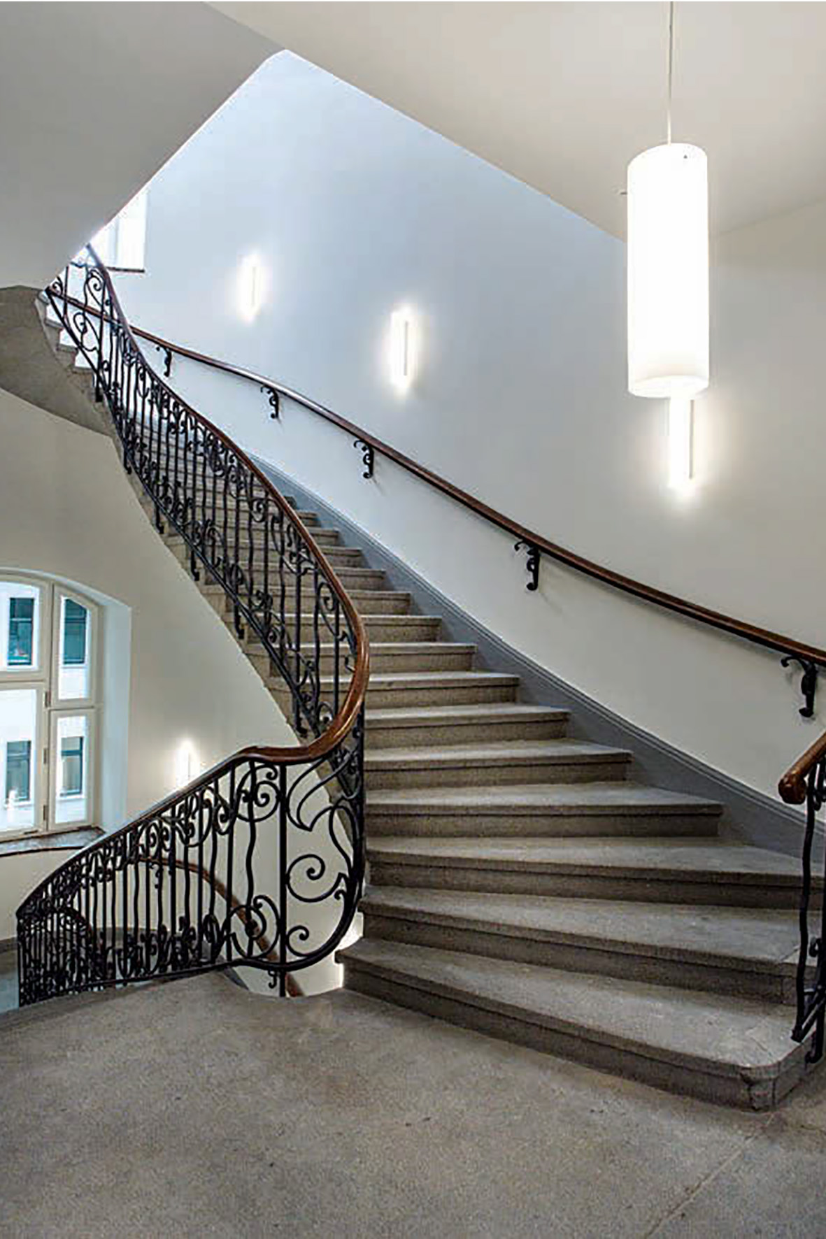 Der geschwungene Treppenaufgang mit kunstvollem Geländer nach der Sanierung.