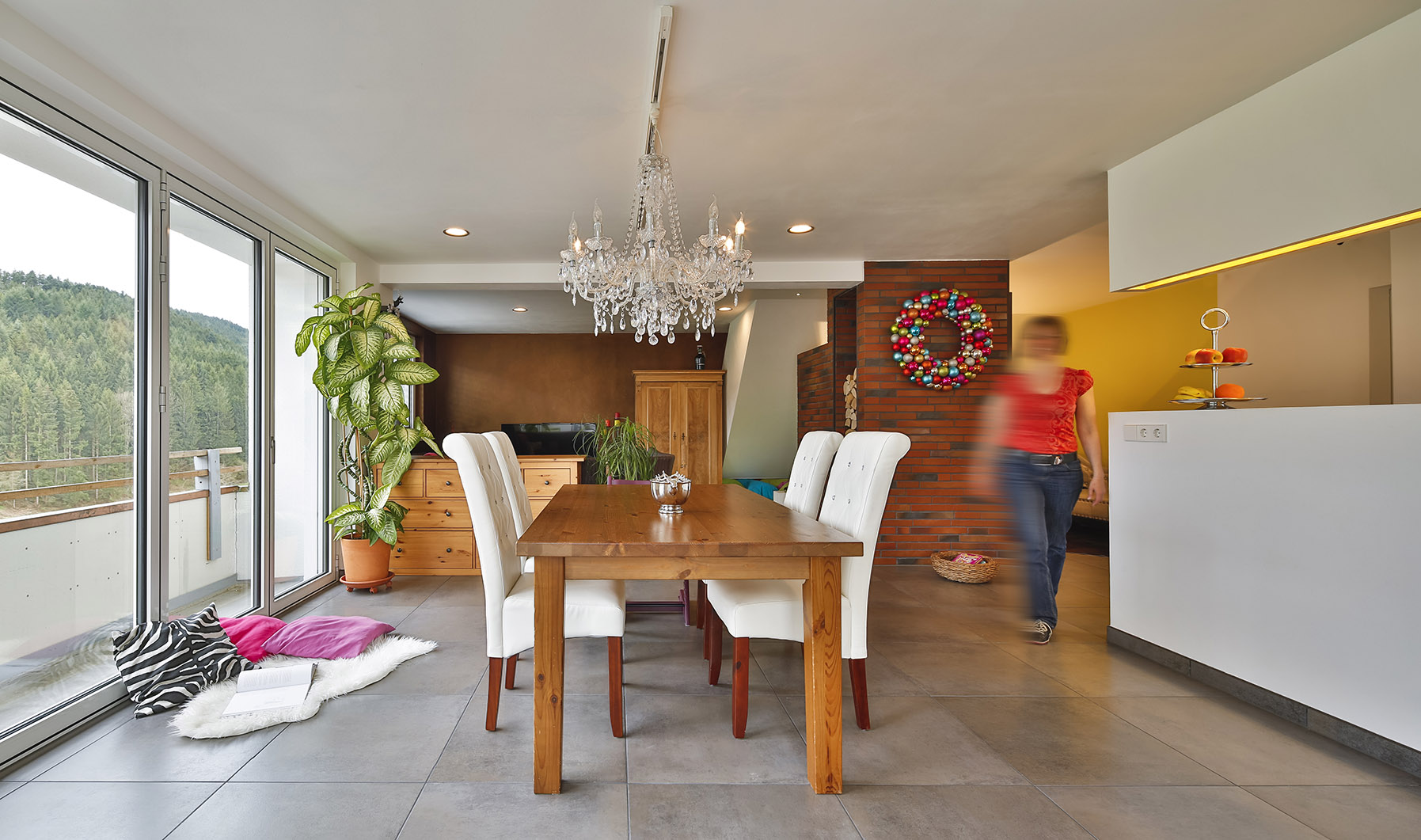 Der Innenausbau erfolgte mit Holzständern, beplankt mit VeroBoard Rapid, einer hochwertigen Ausbauplatte aus Blähglasgranulat. Diese leichte Trockenbauplatte bot enorme Verarbeitungsvorteile. Böhler: „Da wir weder spachteln, schleifen noch grundieren mussten, sparten wir uns enorm viel Arbeitszeit. Außerdem mussten wir die Wände aufgrund der hohen Stabilität und der guten Schalldämmwirkung nur einfach beplanken. Die Fugenkaschierung mit dem selbstklebenden Gewebeband war einfach und der Putz konnte direkt aufgetragen werden.“ Im Bad wurde direkt auf die Platte verfliest. Lediglich in den wasserablaufenden Zonen wie Dusche und Badewanne waren die Platten zusätzlich abzudichten. Die komplette Beplankung der Innenwände, rund 380 Quadratmeter, brauchte so nur wenige Tage. „VeroBoard Rapid war wirklich super-einfach und sauber zu verarbeiten – sogar meine Frau montierte einige Platten“, schmunzelt Böhler. Reststücke der Platten dienen als Balkonverkleidung: Die universelle Bauplatte ist auch außen verwendbar.