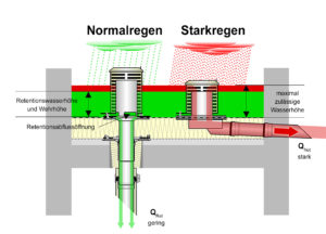 Fehlt der Platz für ein Rückhaltebecken oder die Versickerung im Naturboden, wird Regenwasser durch spezielle Retentionsabläufe mit Drosselrohr kontrolliert auf dem Dach zurückgehalten. Aufgrund der Zunahme von Einleitbeschränkungen in die Grundleitung steigt der Bedarf an Lösungen zur Regenwasserrückhaltung mit zeitverzögertem Abfluss. Hier zeigt Loro nachrüstbare Lösungen mit objektbezogen berechneten Retentionsöffnungen. Passend zur starken Retention bietet Loro leistungsstarke Notentwässerungssysteme – für den Fall, dass der Niederschlag das Retentionsvolumen übersteigt.