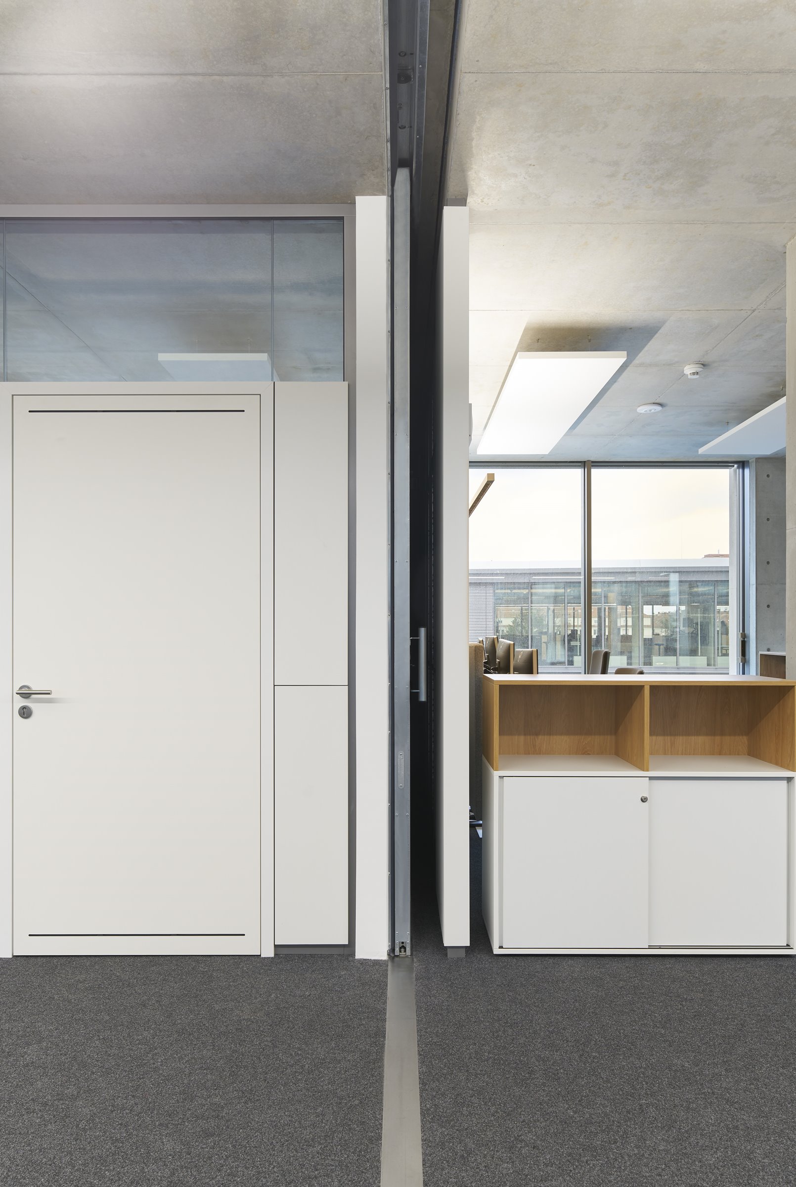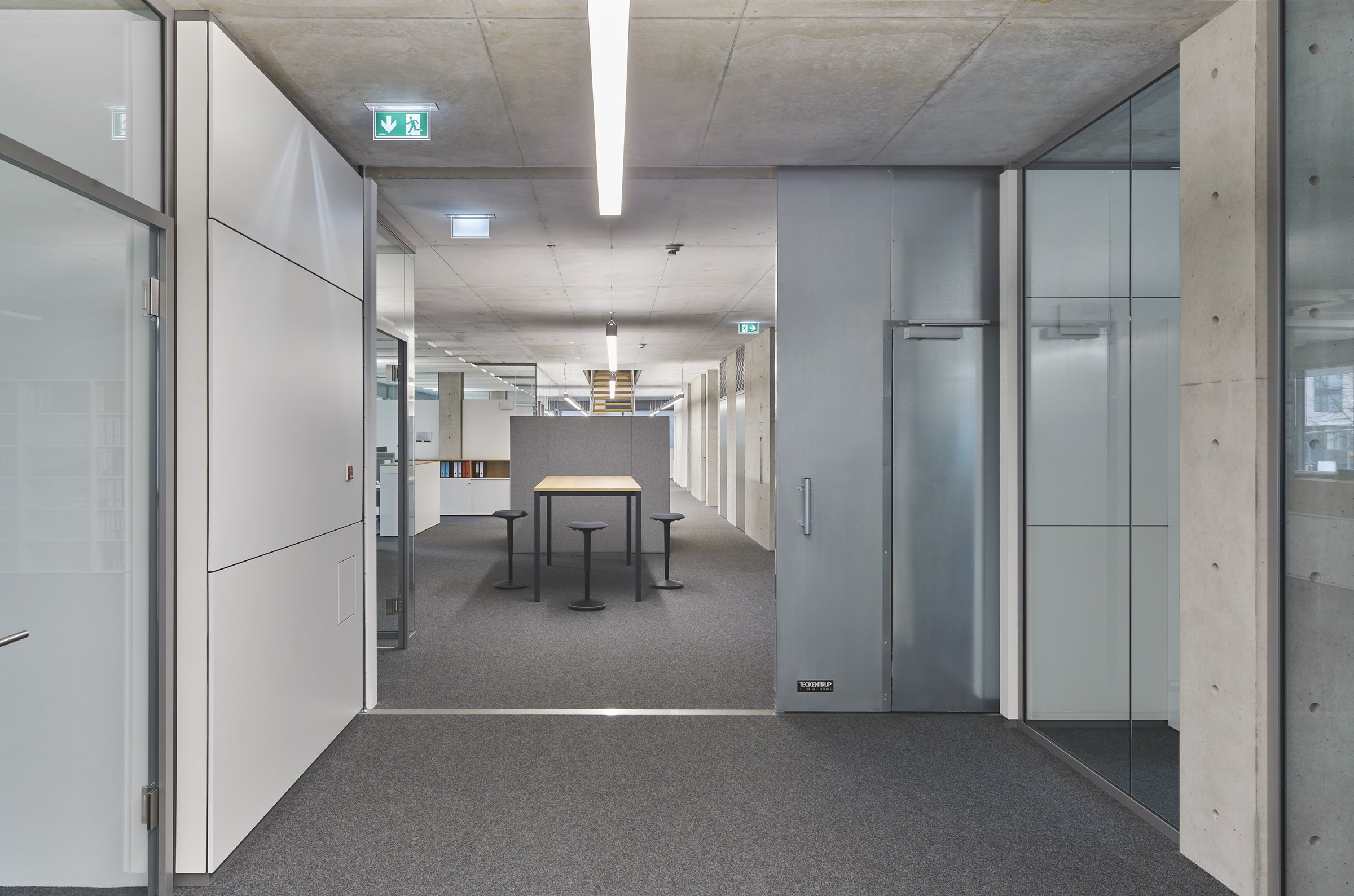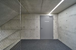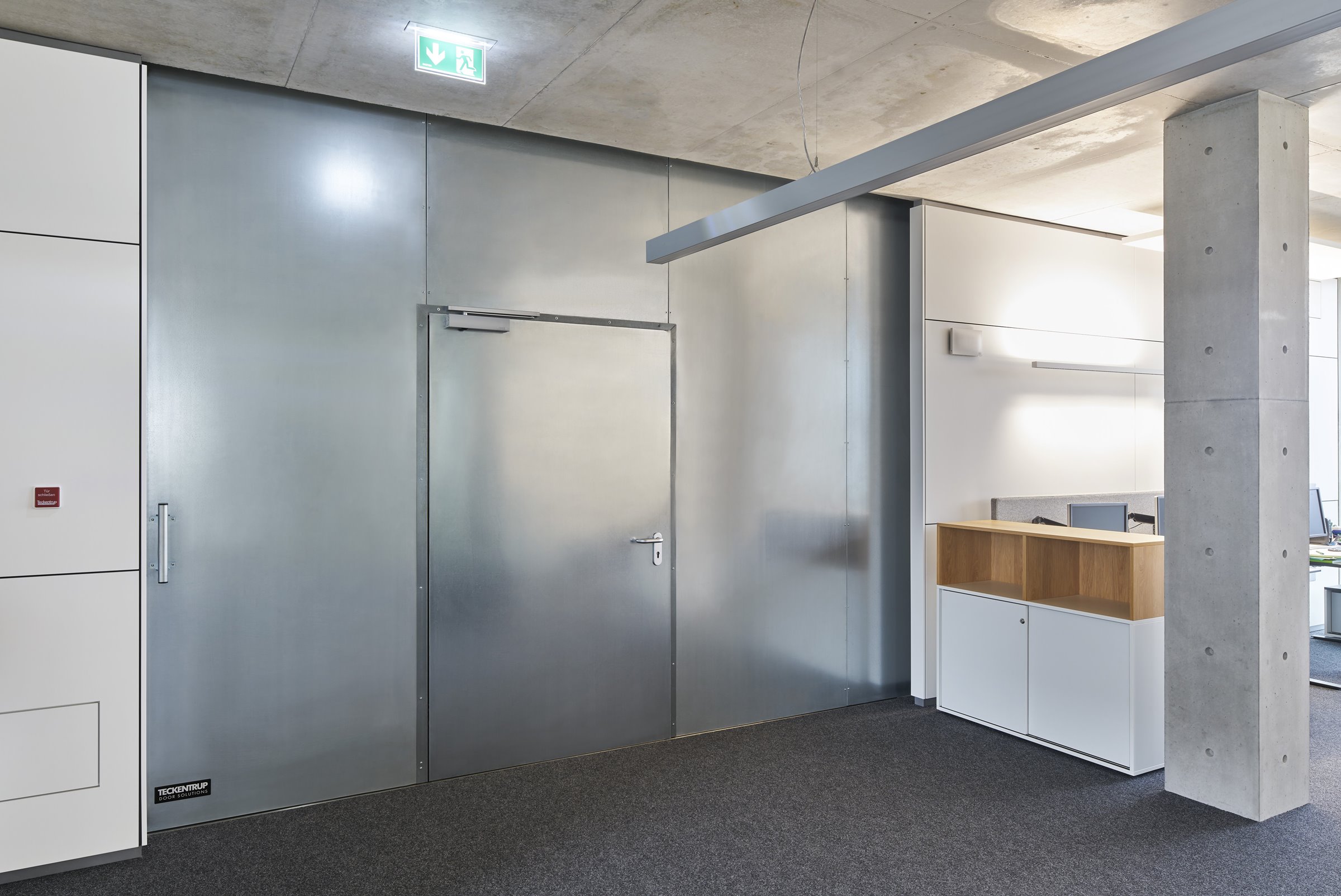 Bei solchen Projekten erfolgt die Auswahl jedes Bauelements unter klaren Qualitäts-Vorgaben. Beispielhaft zeigt das der Blick auf Türen und Tore, die Feuerschutz und Funktionalität im Top-Design vereinen. Die Schiebetore („Teckentrup 62 FST“ EI290) bieten zum einen höchstes technisches Niveau: Sie schützen effektiv vor Feuer und Rauch, die Zulassung ist bereits durch CE-Zeichen gesichert. Im kühl-modernen Industrial-Look fügen sich die Bauelemente dabei harmonisch in die Architektursprache Andos ein: Beispielsweise wurde im Abstellbereich der geöffneten Tore nach der Tormontage eine Vorsatzschale montiert. Durch diese Versenkung in der Wand sind die Tore in geöffnetem Zustand fast nicht sichtbar und erfüllen genau den ando’schen Anspruch an Minimalismus. Dies stellte in diesem Fall zwei besondere Herausforderungen an den Hersteller: Zum einen waren eigens Deckenaussparungen im Beton für das Laufwerk gewünscht, so dass diese optisch nicht wahrnehmbar sind. Zum anderen wurde in diesem Bereich mit einer Stahlunterkonstruktion in F90-Qualität in den Wänden gearbeitet. Eine weitere Besonderheit: Die schwellenlose Schlupftür mit Panikfunktion (Maße: 1.200 mm x 2.100 mm), die den Personenverkehr auch bei geschlossenem Tor ermöglicht und im Ernstfall als Fluchtweg dient. „Hier zahlt sich unsere mittlerweile seit vielen Jahren verfolgte Strategie der ‚Customer Centricity‘ und der Produktentwicklung gemeinsam mit unseren Partnern aus“, resümiert Andreas Sieker, technischer Berater von Teckentrup, „bei frühzeitiger Absprache und Planung lassen sich auch auf den ersten Blick rein funktionale Elemente wie Brandschutztore mit ästhetischen Ansprüchen der Architekten und Bauherren vereinen: Der Trend zu minimalistischen Lösungen ist in der Architektur schon längere Zeit erkennbar, daher haben wir unsere Produktenwicklung genau darauf ausgerichtet und mit Planern und Verarbeitern optimiert. Dass dies nun dazu geführt hat, unsere Tore in diesem Bau zu sehen, bestärkt uns, diesen Weg weiter zu gehen – und macht uns auch ein klein wenig stolz.“