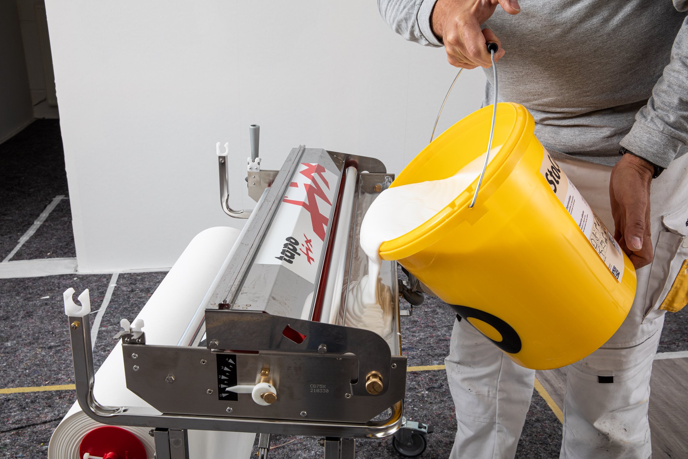 Tapezieren, schnell und einfach: Mit dem neuen verarbeitungsfertigen Dispersionskleber StoColl TG entfällt das Anrühren, der Kleber kommt direkt aus dem Eimer. Das beschleunigt den Arbeitsfortschritt und Wasser- und Stromanschluss sind nicht notwendig. Der Auftrag erfolgt mit der Tapeziermaschine, alternativ funktionieren Airlessgerät oder Rolle. Der Kleber wurde für Raufaser entwickelt, eignet sich aufgrund seiner hohen Klebkraft aber auch für leichte und mittlere Malervliese. Im Vergleich zu einem Kleister verfügt StoColl TG über eine höhere Klebkraft und kürzere Trocknungszeit: Bereits am nächsten Tag ist der Wand- oder Deckenbelag überstreichbar.