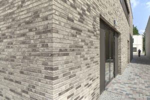 Immer dann, wenn ein zweischaliges Mauerwerk zu aufwendig, zu platzraubend oder eine Lösung mit Klinkerriemchen statisch ungeeignet ist, schlägt die Stunde der extrem leichten Flachverblender – unabhängig davon, ob auf einem Wärmedämm-Verbundsystem (WDVS) oder dem vorgehängten hinterlüfteten Fassadensystem (VHF) StoVentec R. Die nur vier bis acht Millimeter starken Elemente zeigen kaum thermische Ausdehnung und können daher ohne störende Feldbegrenzungsfugen ausgeführt werden. Sie lassen sich zudem ohne aufwendige Detailausbildungen mit anderen Oberflächenmaterialien wie Putzen oder StoDeco-Fassadenelementen kombinieren. Eine typische Ausführungsvariante – StoCleyer B im Sockelgeschoss und Putz in den darüber liegenden Stockwerken – kann so ergebnissicher und kostensparend umgesetzt werden. Für die flexiblen Flachverblender sind auch Radien kein Problem. Da zwischen der Applikation und der Verfugung keine Trocknungszeit erforderlich ist, erfolgt das Verlegen sehr rasch.