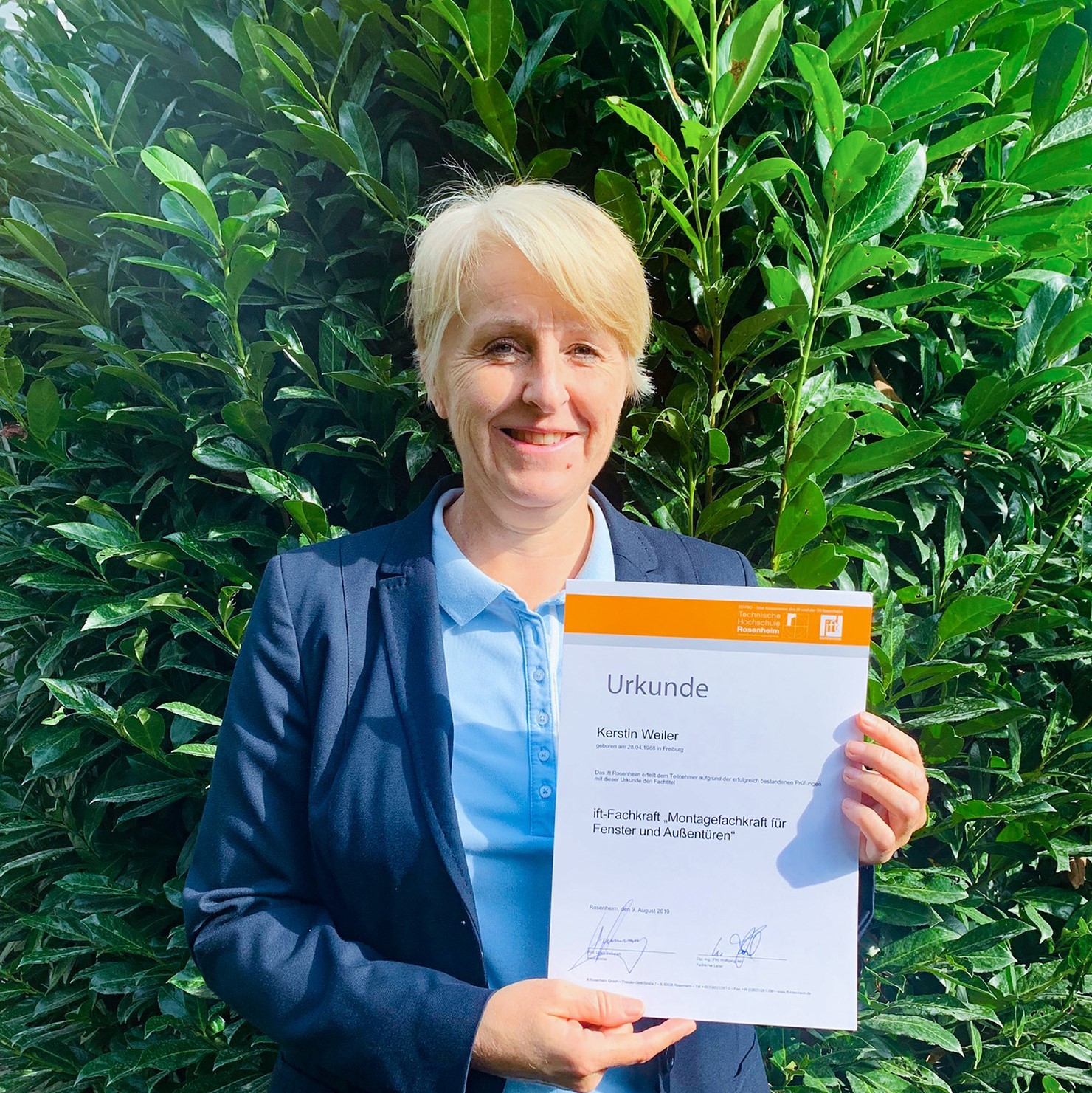 Kerstin Weiler, Vertrieb Anwendungstechnik, bestand die Prüfung zur „ift-Montagefachkraft für Fenster und Außentüren“ mit der Note ‚gut´.