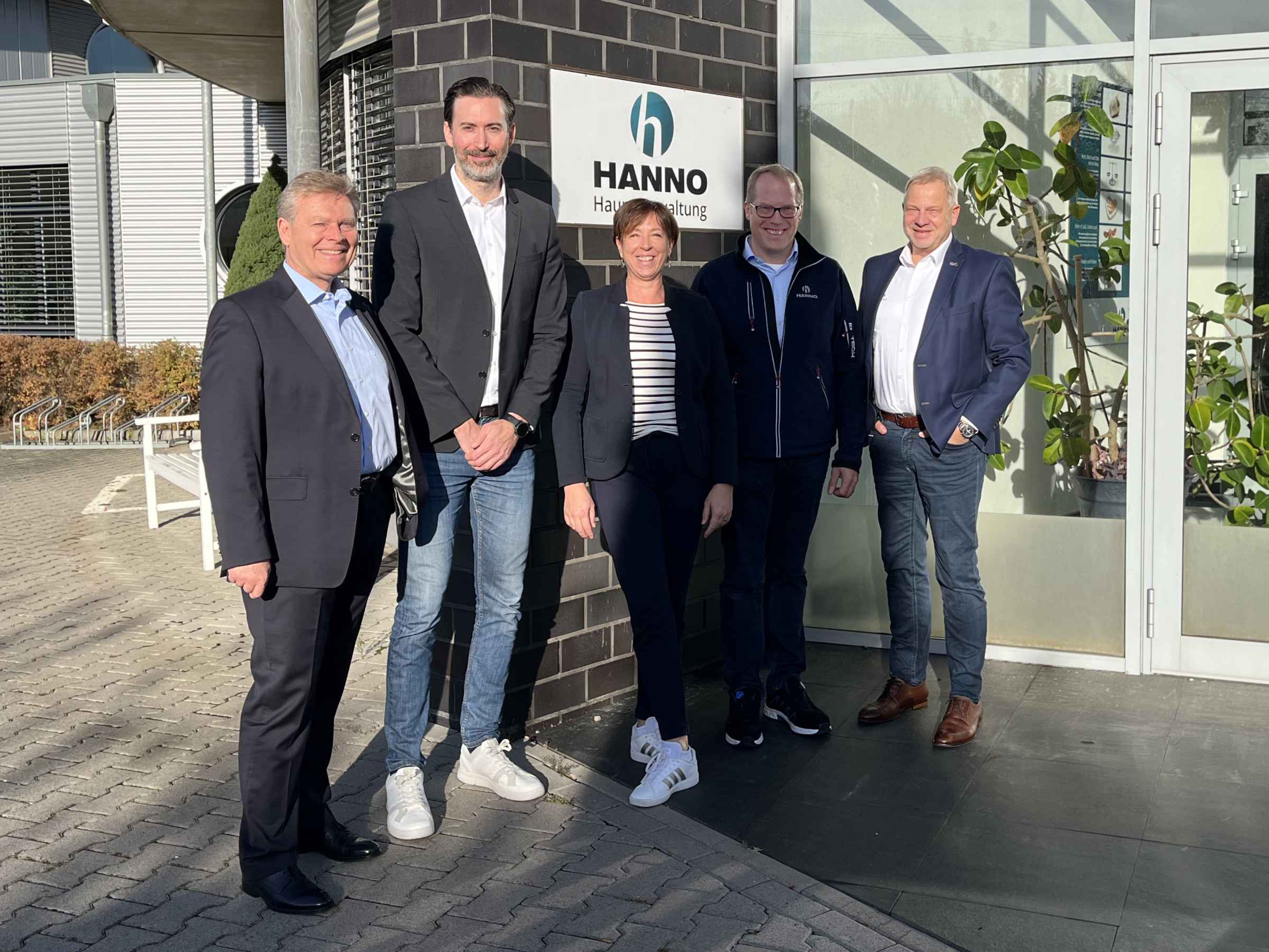 Freuen sich über die erweiterte Partnerschaft zwischen Hanno und BASF (v. l.): Dr. Dietmar Wingerath (Basotect-Vertrieb Europa BASF), Florian Köhnen (Leiter Einkauf Hanno), Tina Fries (Vertriebsleiterin BASF), Dr. Andreas Hohlfeld (Leiter Forschung und Entwicklung Hanno) und Markus Fehrmann (Vertriebsleiter Hanno).