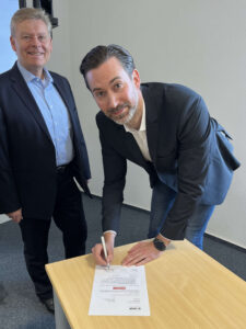 Vertragsunterzeichnung zu Basotect EcoBalanced (v. l.): Dr. Dietmar Wingerath (Basotect-Vertrieb Europa BASF) und Florian Köhnen (Leiter Einkauf Hanno).