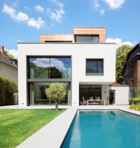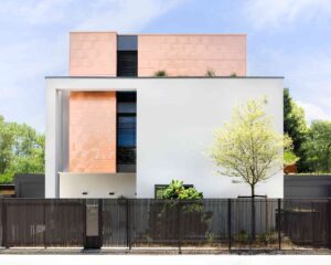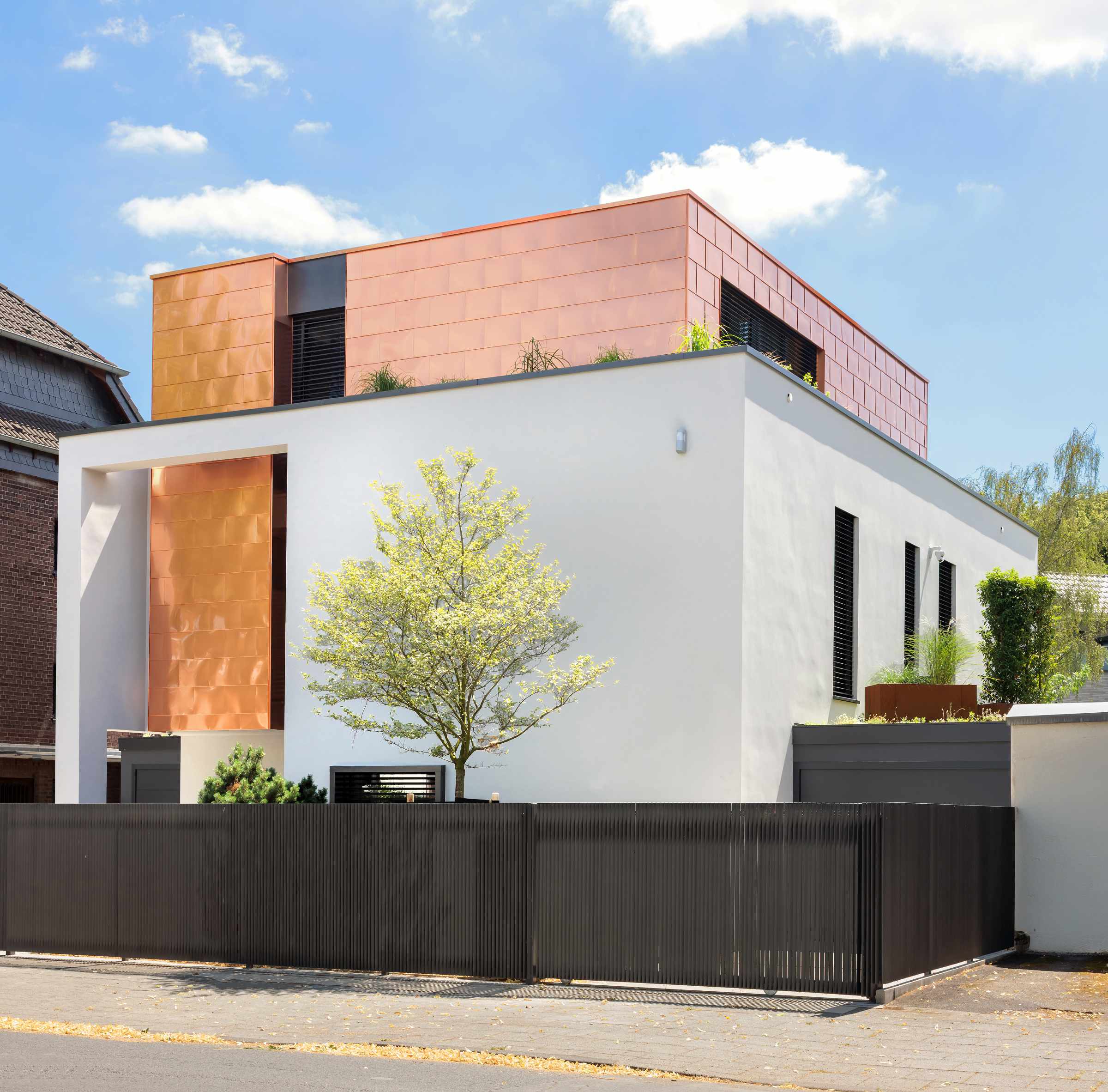 Ein Hingucker: Das trifft auf die außergewöhnliche Villa in Köln-Rodenkirchen zu. Kubatur und Fassadengestaltung zeigen sich selbstbewusst nach außen. Kein einfacher Würfel, sondern akzentuierte Teilkuben; keine einfache, weiße Standard-Putzfassade, sondern Kupfer-Schindeln, die auf Teilflächen ihre besondere Wirkung entwickeln. Für die perfekte Wirkung ist auch wichtig, dass nichts den flächigen Eindruck stört – noch nicht einmal ein Fallrohr. Diese liegen deshalb hinter der Fassade, im Dämmsystem. Ebenso unverzichtbar: Die akkurate Handwerksarbeit. Metallfassade und Dach-/Dachterrassen-Entwässerung übernahm der Fachbetrieb Nebeler.
