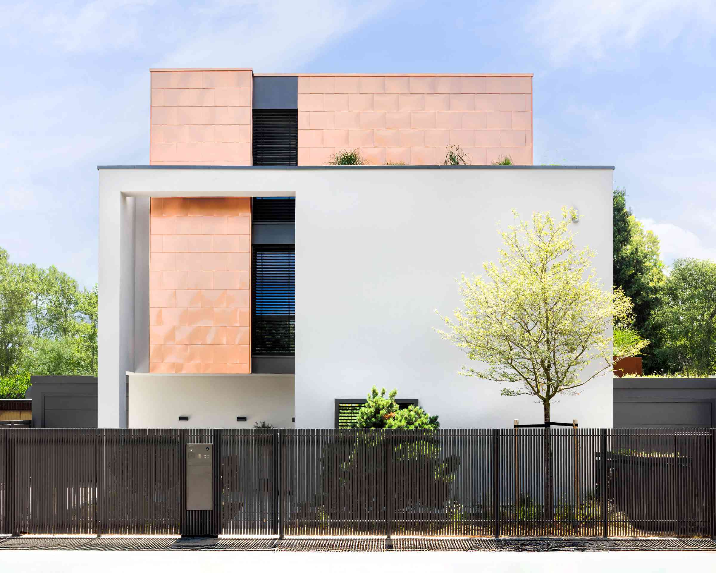 Beeindruckender Baukörper: Der Kupfer-Kubus wirkt wie in den Putzbau hinein gestellt. Zum Garten hin zeigt sich der Bau offen.