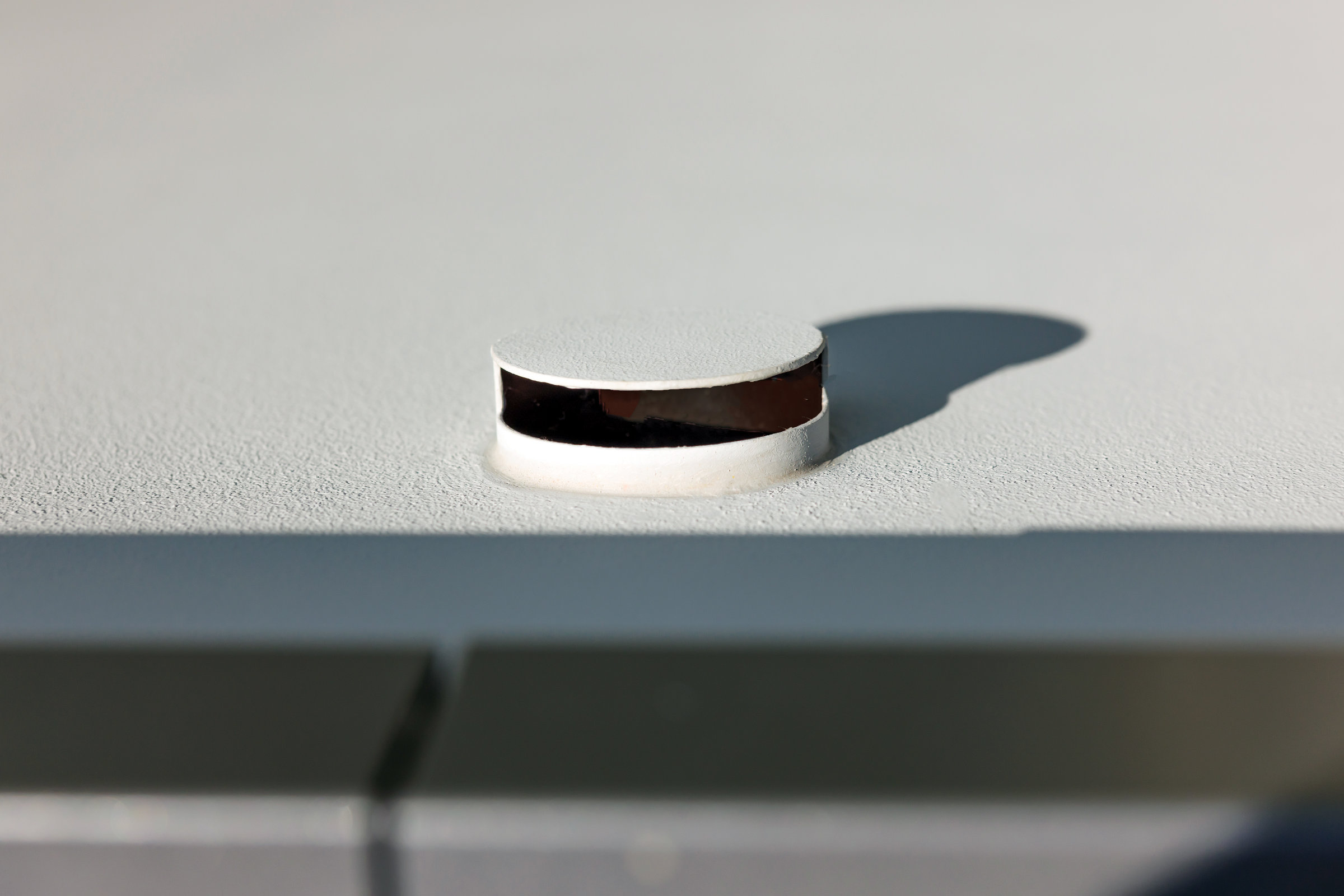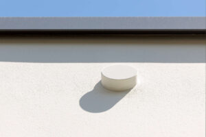 Damit die Entwässerung das Fassadenbild nicht stört, verlaufen die Fallleitungen hinter der Fassade. Nur für die Entlüftung der Rohre ist ein Durchbruch notwendig. Dies ist elegant mit einer „Wuppertaler Blende“ im Farbton des Fassadenputzes gelöst. Von unten ist die Blende geschlossen und fügt sich so harmonisch in die Fläche ein.