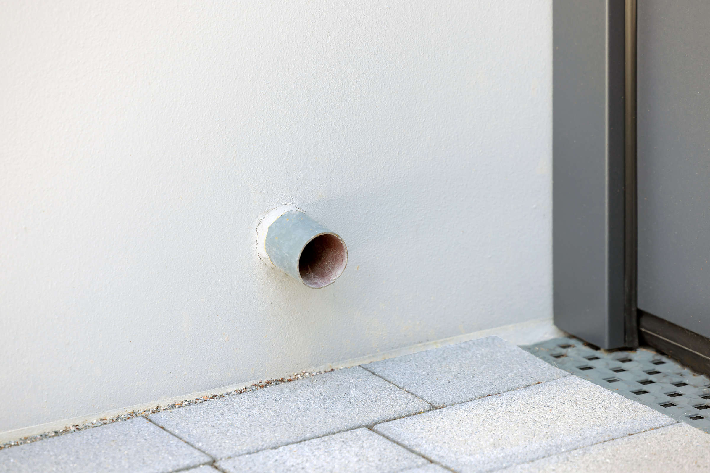 Minimaler Fassadendurchbruch für die Notentwässerung mit einem schmalen DN-50-Rohr.