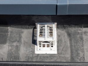 Auf dem nicht einsehbaren Flachdach geht es um (Abfluss-)Leistung. Durch die Wahl der Loro-Duofux-Attika- Direktabläufe genügen zwei Ablaufpunkte, um die gesamte Fläche sicher zu entwässern.