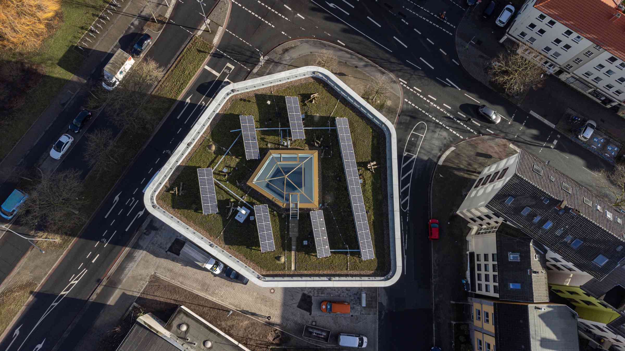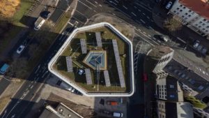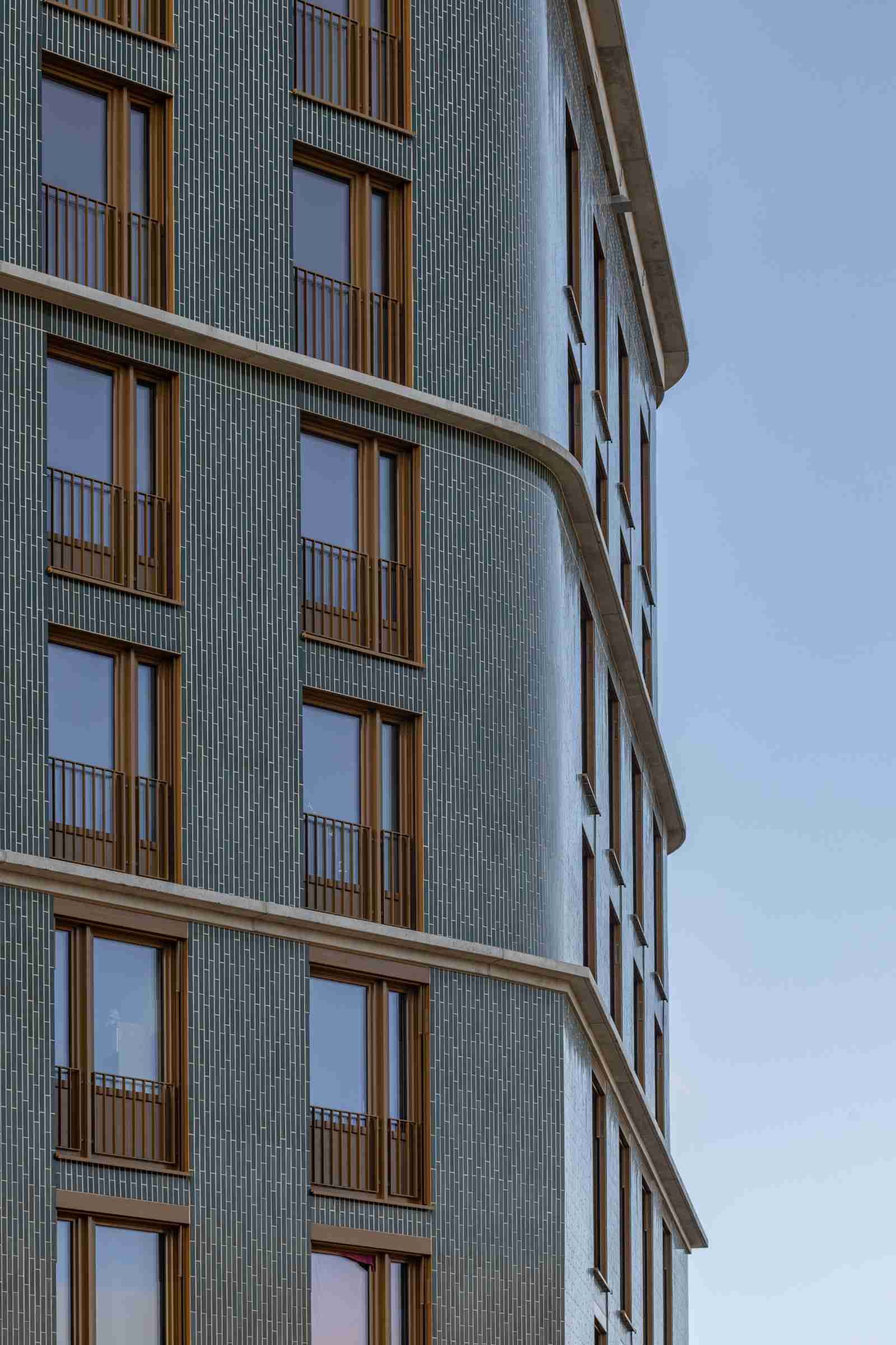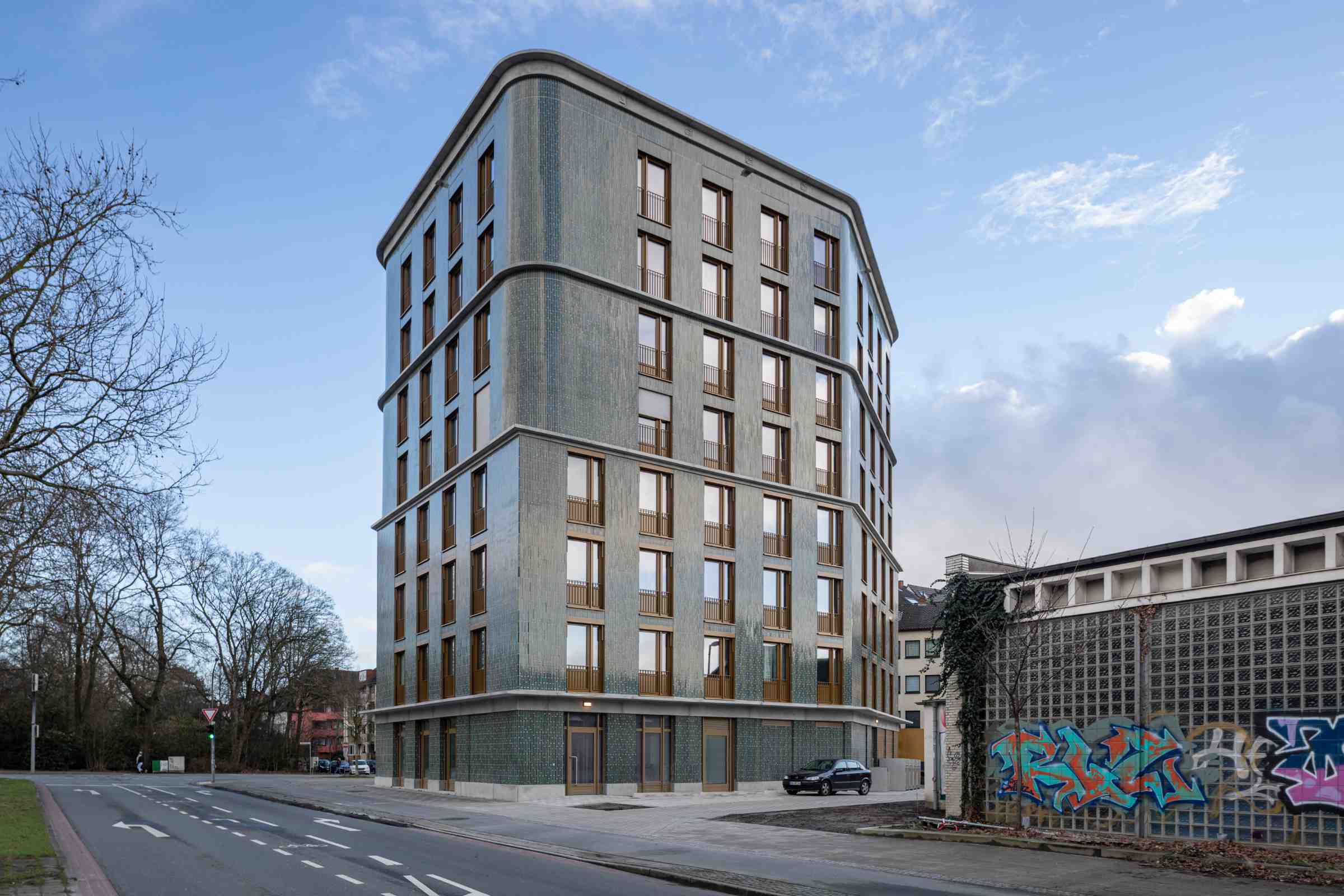 Das „Grüne Haus“ in Bremen setzt mit markanter Kubatur und einer Fassade aus glasierten Klinkerriemchen einen städtebaulichen Akzent auf einem keilförmigen Grundstück am Quartiers-Eingang „Hohentorsplatz“. Der Bau kombiniert frei finanzierte und geförderte Wohnungen mit Gastronomie. Das moderne Energiekonzept – hoch gedämmte Fassade und extensiv begrüntes Flachdach mit PV-Anlage – sorgen für einen niedrigen Energiebedarf.