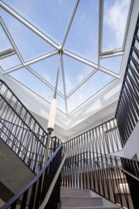 In der Gebäudemitte liegt das Treppenhaus, das durch die Glasüberdachung mit Tageslicht versorgt wird.