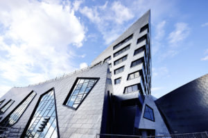 Blick auf die Fassade des Leuphana-Zentralgebäudes. Das elektrochrome Glas von EControl passt sich perfekt in das architektonisch anspruchsvolle Bauwerk von Stararchitekt Daniel Libeskind ein.