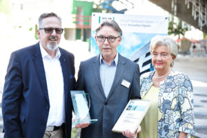 Hans-Joachim Arnold (AR Vorsitzender der Isolar Gruppe, links) überreichte persönlich die Auszeichung an Manfred Dittmar von EControl-Glas und an Rosemarie Natter für das Objekt Leuphana Campus in Lüneburg.